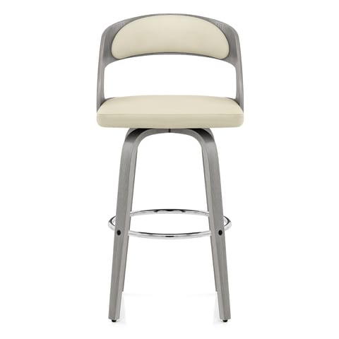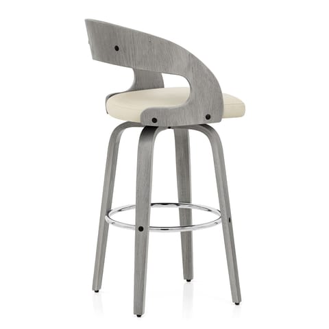 The stool’s solid frame has an antique grey wood finish which provides a natural complement to the cream faux leather above. A circular chrome footrest braces four legs, each curving stylishly outwards and tipped with height adjustable protective plugs that help in avoiding scratches. Finally, a 360-degree swivel function makes for convenient adjustment and easy access to your bar or worktop.