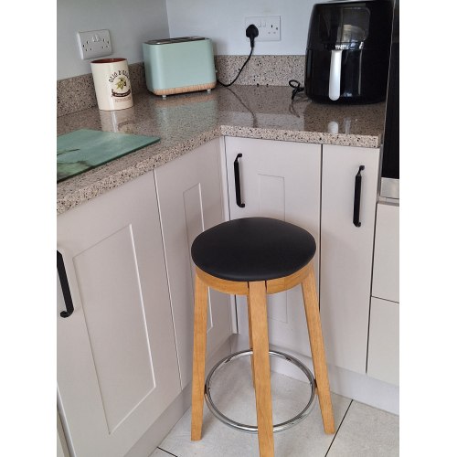 Fabulously compact, the beauty of its backless shape means it can be stored beneath the worktop overhang when not needed. Offering quality comfort, the trendy black faux leather seat is nicely cushioned, sat atop a solid wooden frame that is both rustic and reliable.