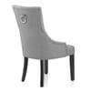 In a gorgeous shade of light grey, the fabric upholstered seat offers luxurious comfort due to the belted frame and dense padding. The seat has many stylish details, including quilted buttons and chrome stud edging for classic opulence. Plus, the encompassing backrest features a chrome ring knocker on the rear as a decorative focal point.