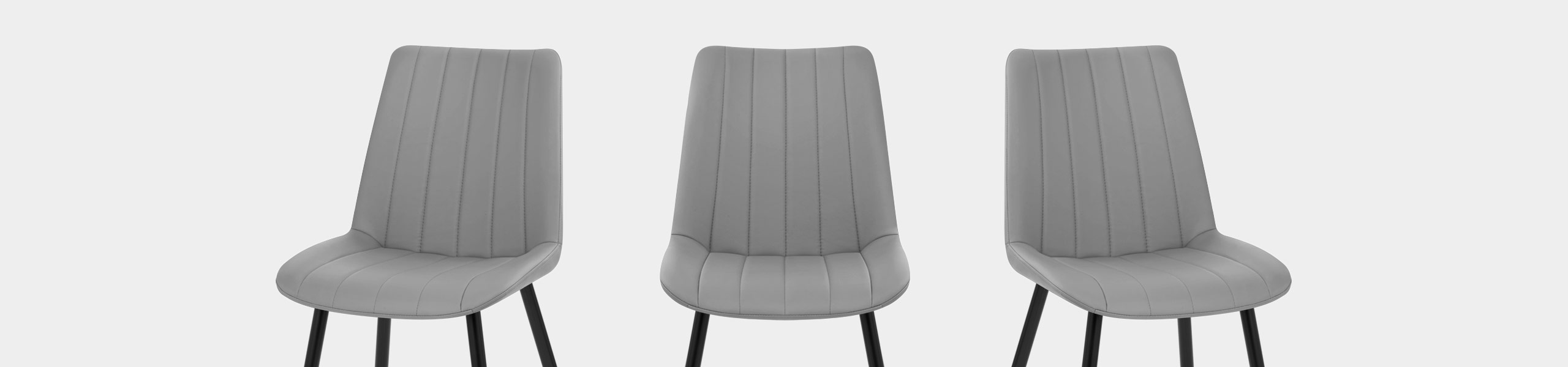 Dense padding makes the faux leather seat feel reliable and supportive, with a tall backrest creating a still more inviting picture of comfort. The chair’s versatile mid grey hue, and its tasteful lines of vertical stitch detailing, offer a graceful contrast against the frame below.