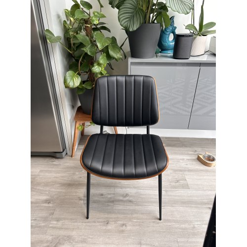 Gently and ergonomically curved, both the high backrest and the padded seat cushion are covered in a gorgeous black faux leather and supported by walnut finished bentwood. Each has decorative detail in the form of stitched lines from top to bottom, accentuating the way that light bounces off it. For further decor, the backrest is slightly elevated, creating a letterbox space.