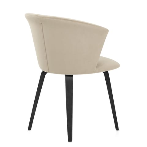 The scroll-shaped backrest sports a medium-height build and enveloping sides, which are enhanced by a visual display of vertically stitched segments. Contrasting with the back of the chair is a smooth seat pad upholstered in decadent mink velvet, and cushioned for additional support.
