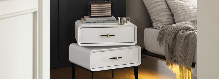 Bedside tables are crafted from a variety of materials, each offering different aesthetics and functional qualities. Wood is one of the most common, providing durability, furthermore this can also be lacquered or wrapped in faux leather allowing it to be showcased in a multitude of colours. Metal framed bedside tables, often seen in industrial or modern designs, offer a sleek, minimalist appearance with extended durability. Additionally, tables with stone tops or mirrored surfaces bring a luxurious, high-end feel that is resilient and easy to maintain. Keeping a theme in your room will help to tie all the furniture together.