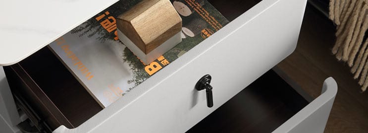 For example, what kind of sleeper are you? If you are prone to knocking things off your table in the night, why not try one with a lip that curls up, edging the top? This catches the smaller items before they fall, while helping the larger items stay balanced. Do you have children or pets? Perhaps consider if a push button would keep the drawer contents safer than handles that they can grab onto. Will you be placing larger, weightier items on top? Maybe opt for a sturdier unit with a lower centre of gravity to keep things secure. Enjoy taking a glass of wine or a cup of tea to bed? Stone tops are super easy to wipe clean and sustain.
