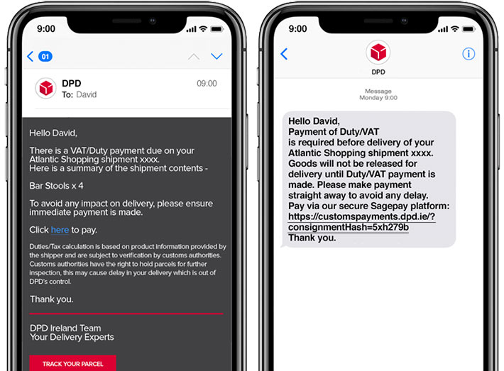 Once we have dispatched your order and prior to your delivery, DPD will contact you via email and or SMS with details of the amount of Irish VAT / Duty due, along with a link to their Secure Payment Portal for you to make payment as seen below. Making the duty payment as quickly as possible will help ensure your delivery is not delayed whilst on its way to you.
