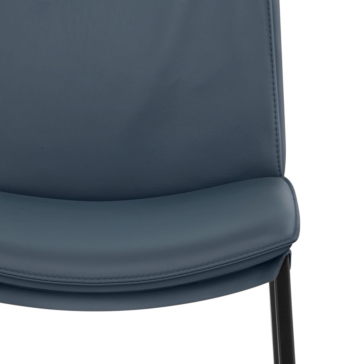 For your comfort, the seat features an additional padded layer across the tall backrest and plush seat pad. This layer curves over the top of the backrest, adding a splash of character to the minimalist look. To add to this and create depth, piping edges the seat, and all is upholstered in a blue and luxurious real leather.