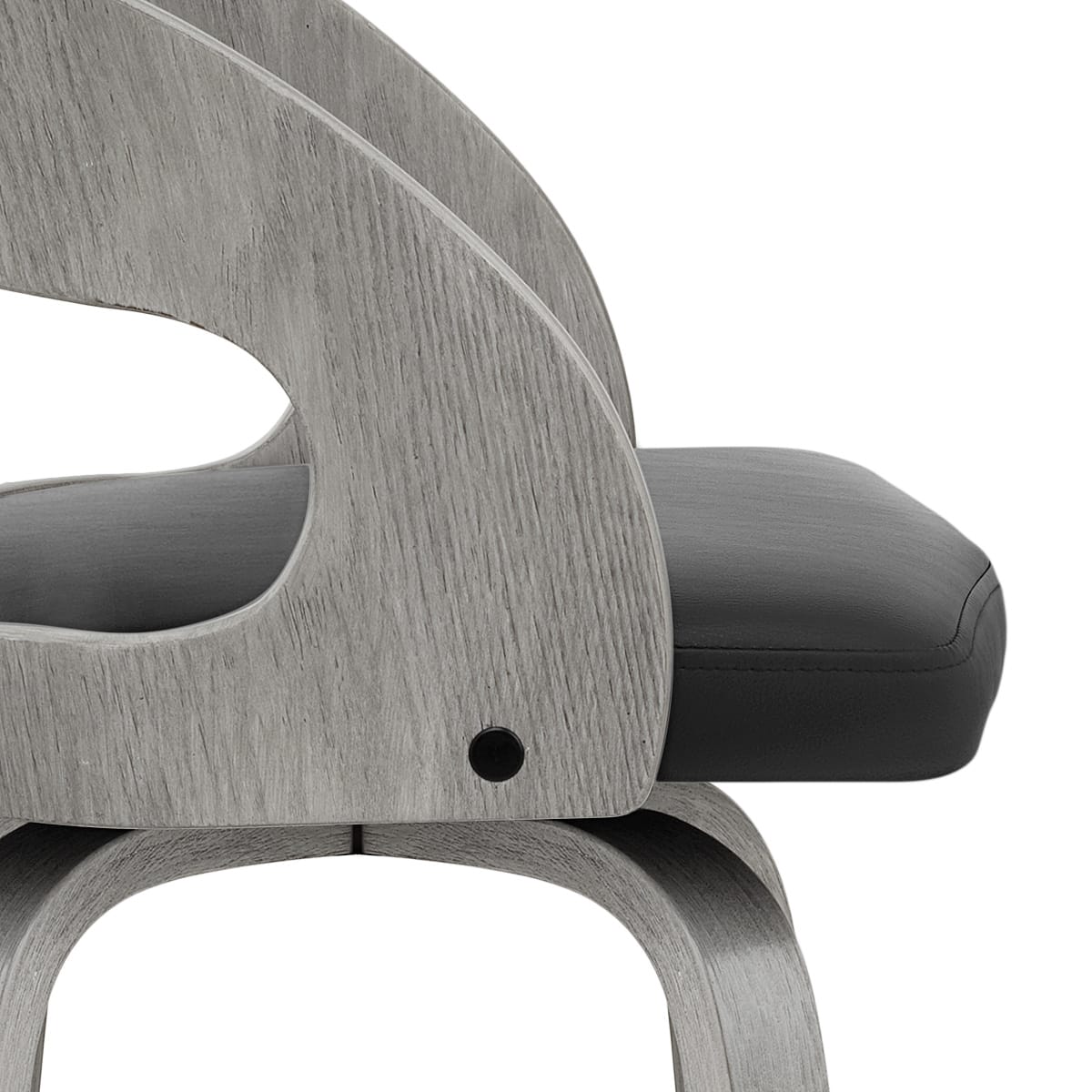 With the same grey wood finish as the backrest, the frame sits fixed at kitchen counter height and comprises of four, smooth and strong legs. These are encircled by a chrome footrest, and for further convenience, the stool also allows for a 360-degree swivel of the seat. Capping these legs are four, adjustable floor plugs, not only protecting your surfaces from marks, but also counteracting uneven ground.