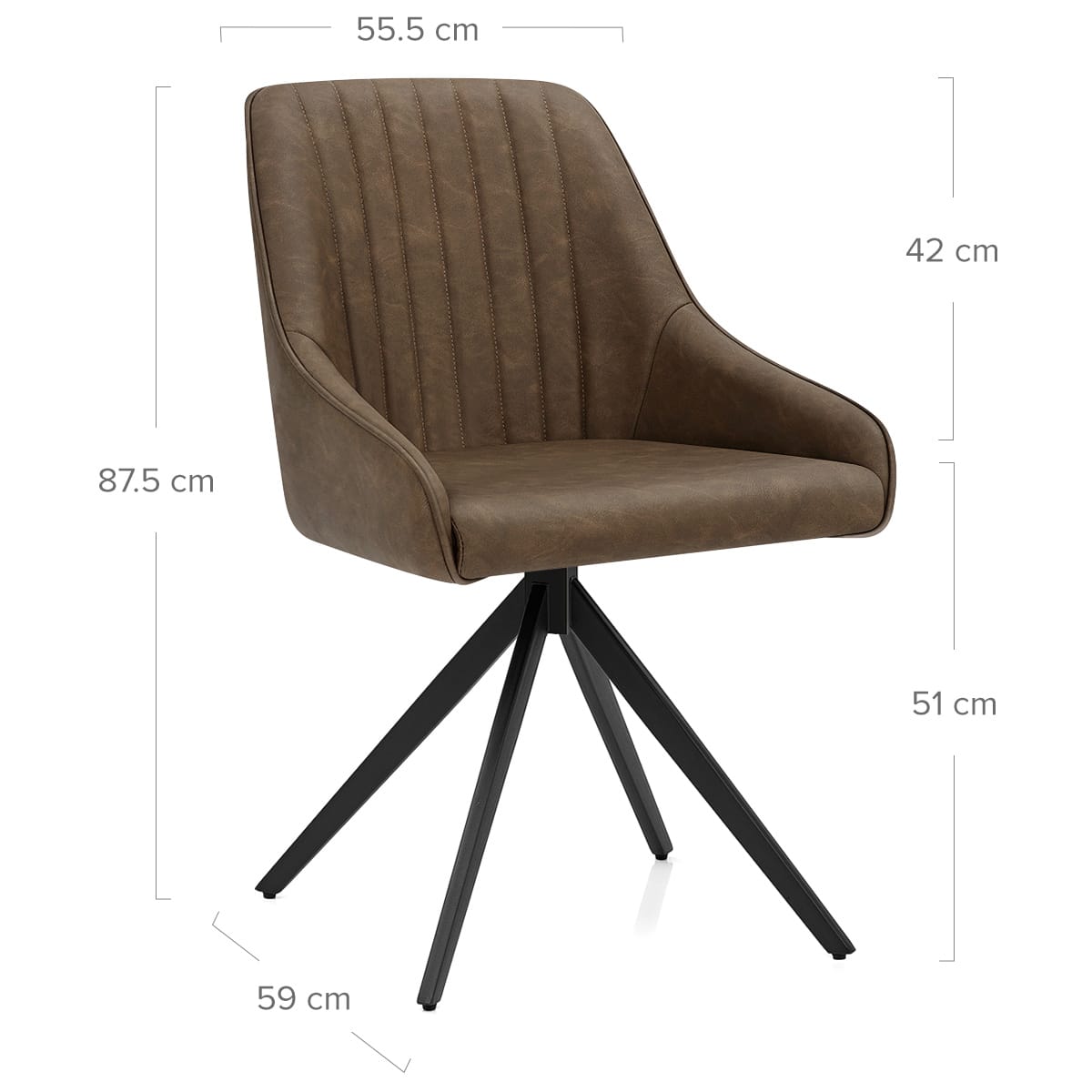 Appropriate shape for offices and dining rooms alike, the comfortable seat is upholstered in a brown faux leather and ergonomically shaped to support you. Behind the high backrest is a handle, to allow for easy repositioning of the chair, and the front is patterned with fine, vertical stitching. The sides of the backrest descend around the seat to provide added confidence as you rest.