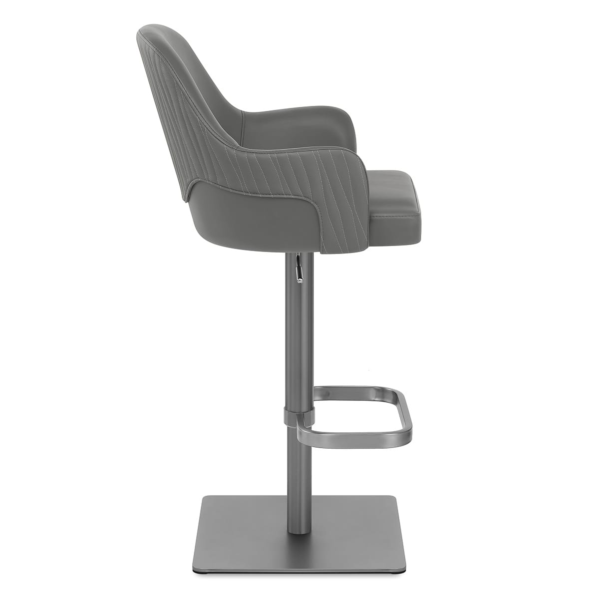 Containing a convenient gas lift mechanism and with a brushed graphite finish, the frame is as comfortable as it is stylish. The mechanism lets you change the height of the seat as well as swivel it a full 360 degrees. Lower down the column, the frame is further conveniently equipped with a rectangular footrest. Weighted for extra stability, the base is square shaped and expertly welded and the use of felt pads beneath help to protect your floors from scrapes.