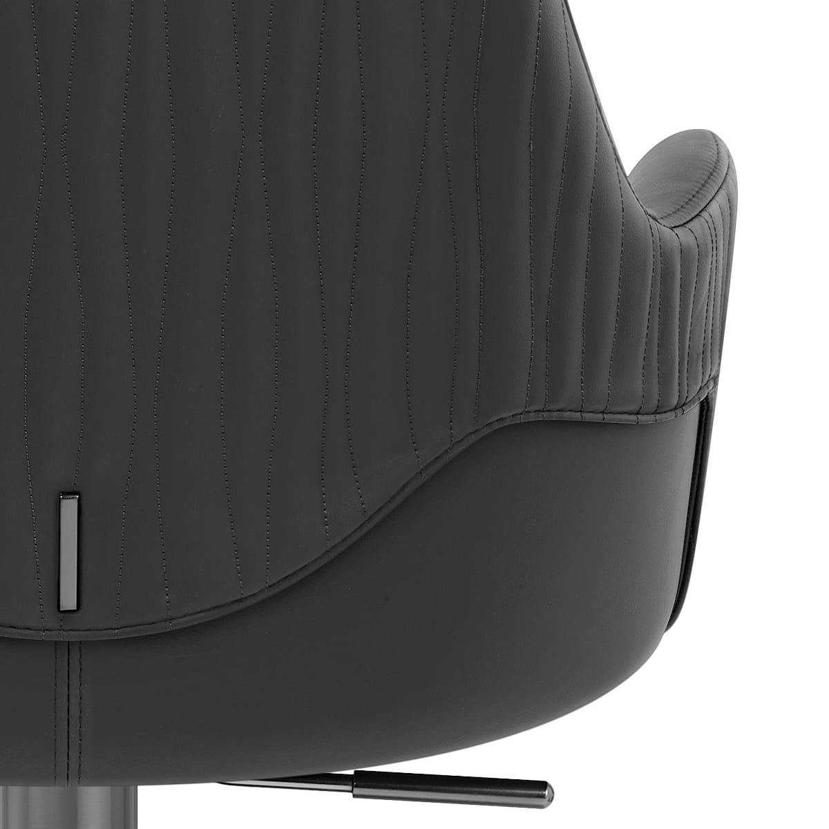 The seat is all about comfort and distinction. A tall backrest and wraparound arms offer armchair-style support, while a nestled and thickly padded cushion invites relaxation. Cloaked in black faux leather, the double-layered design of the outer back features elegant stitch detailing and is crowned by a rectangular graphite accent, centrally placed.