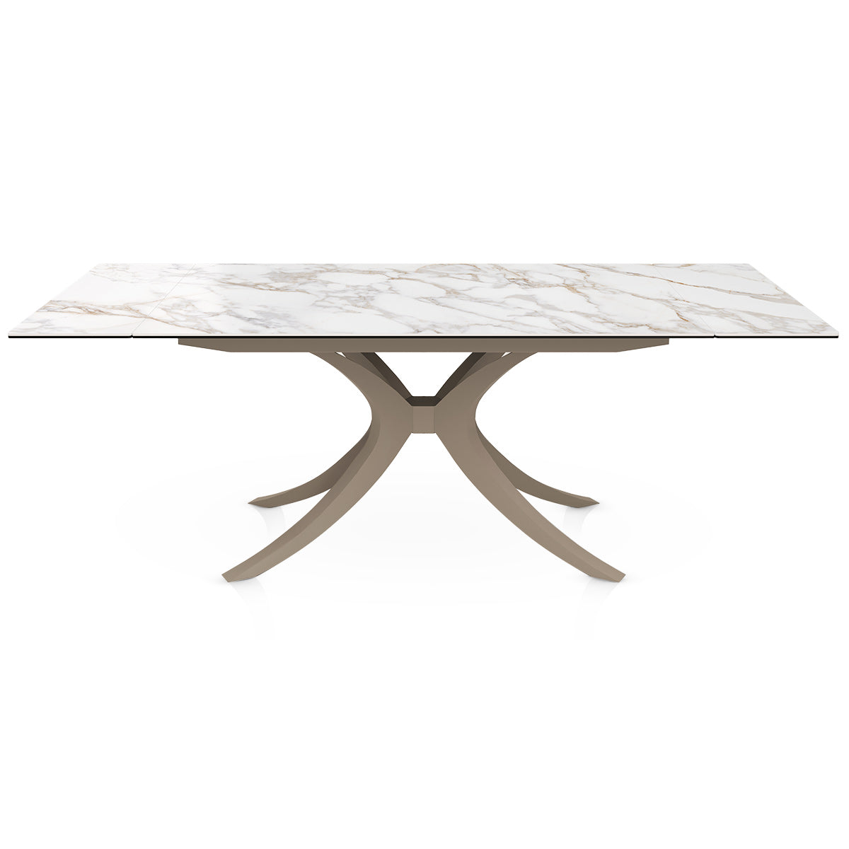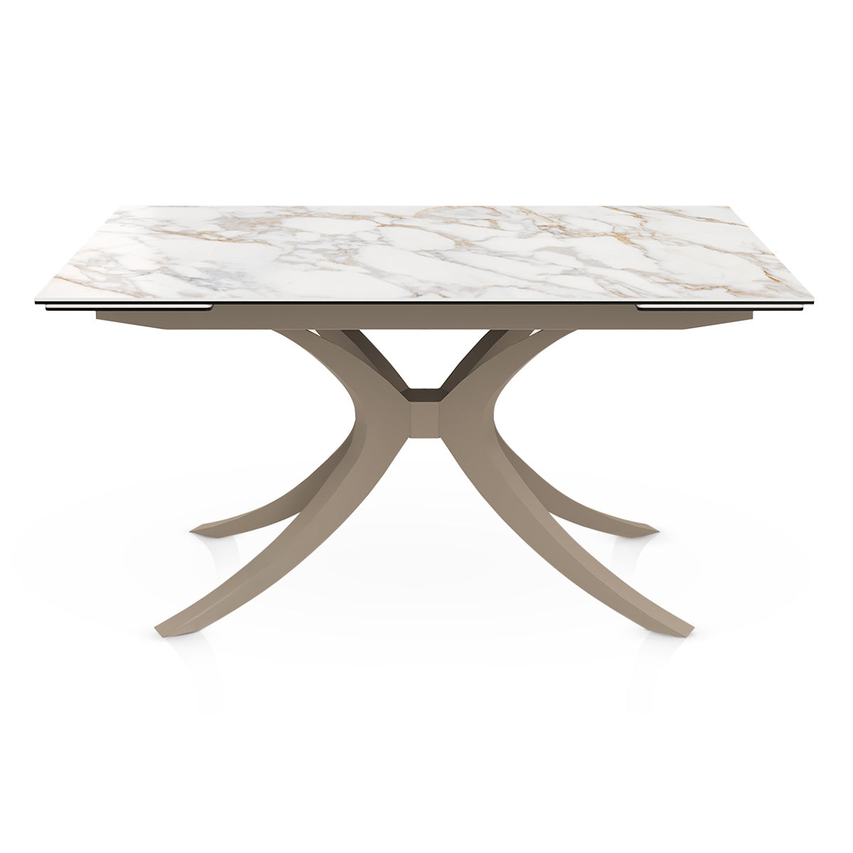 The table rests on an artistic metal frame finished in a warm bronze tone. Its sweeping, curved legs intersect at the centre, creating an eye-catching sculptural effect that supports the table with strength and balance. Bracing bars run beneath the top for reinforcement, while protective feet help to keep floors unmarked. A stunning fusion of elegance and resilience, this frame completes the table's contemporary aesthetic with timeless appeal.