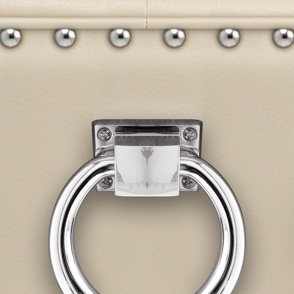 Upholstered in sumptuous cream bonded leather, the webbed seat pad provides outstanding comfort. Stylish and sophisticated, the seat is edged with opulent chrome studs and the quilted button detail in the backrest lends an exclusive feel. Plus, the decorative chrome ring on the rear of the seat makes for a glamorous feature.