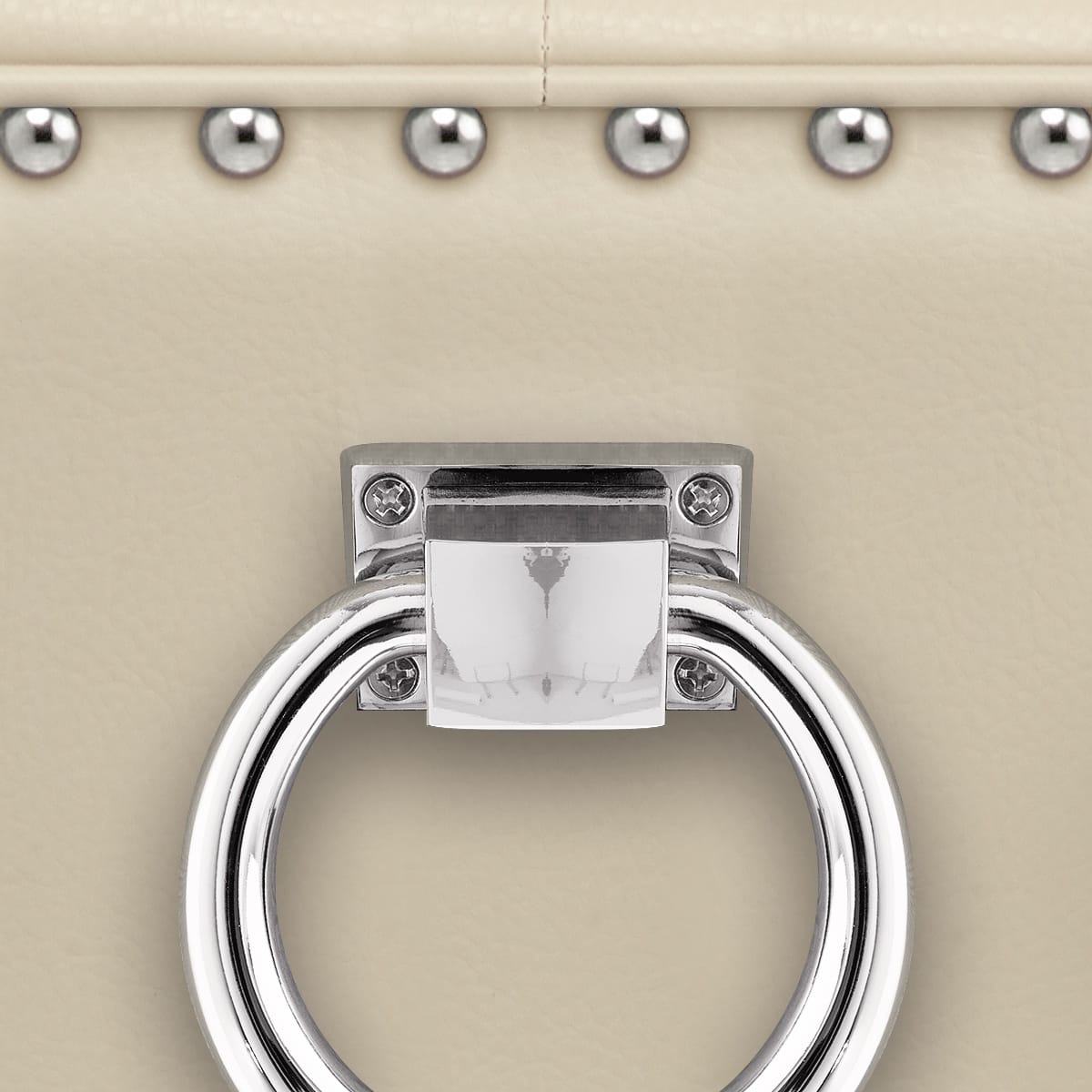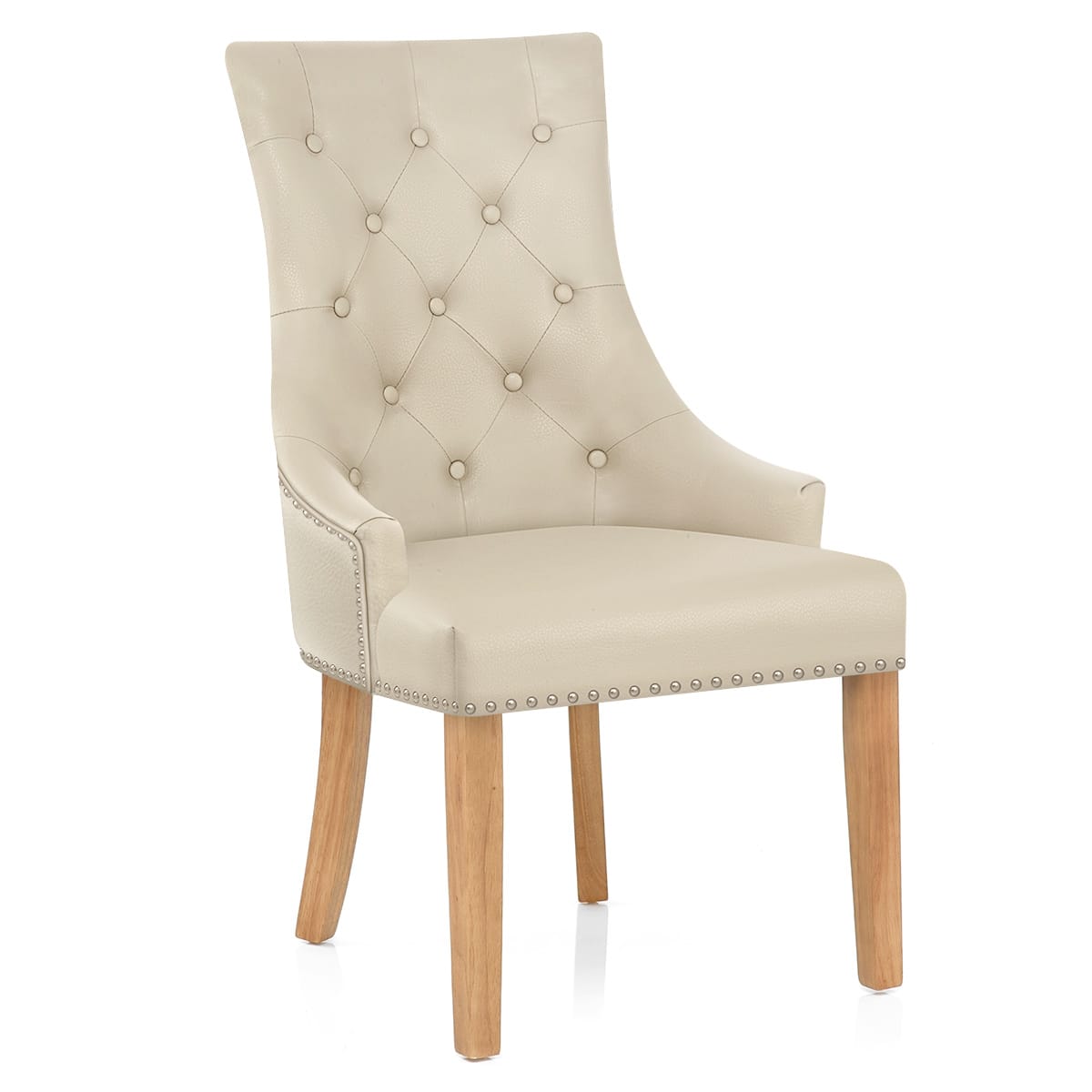 With cream bonded real leather upholstery and a belted seat pad, you can expect complete comfort when seated. The high backrest offers the utmost support and has a touch of class thanks to the quilted button detailing. Giving the chair its richness, chrome studs edge the seat and the rear of the backrest, which also features a tasteful matching chrome ring.