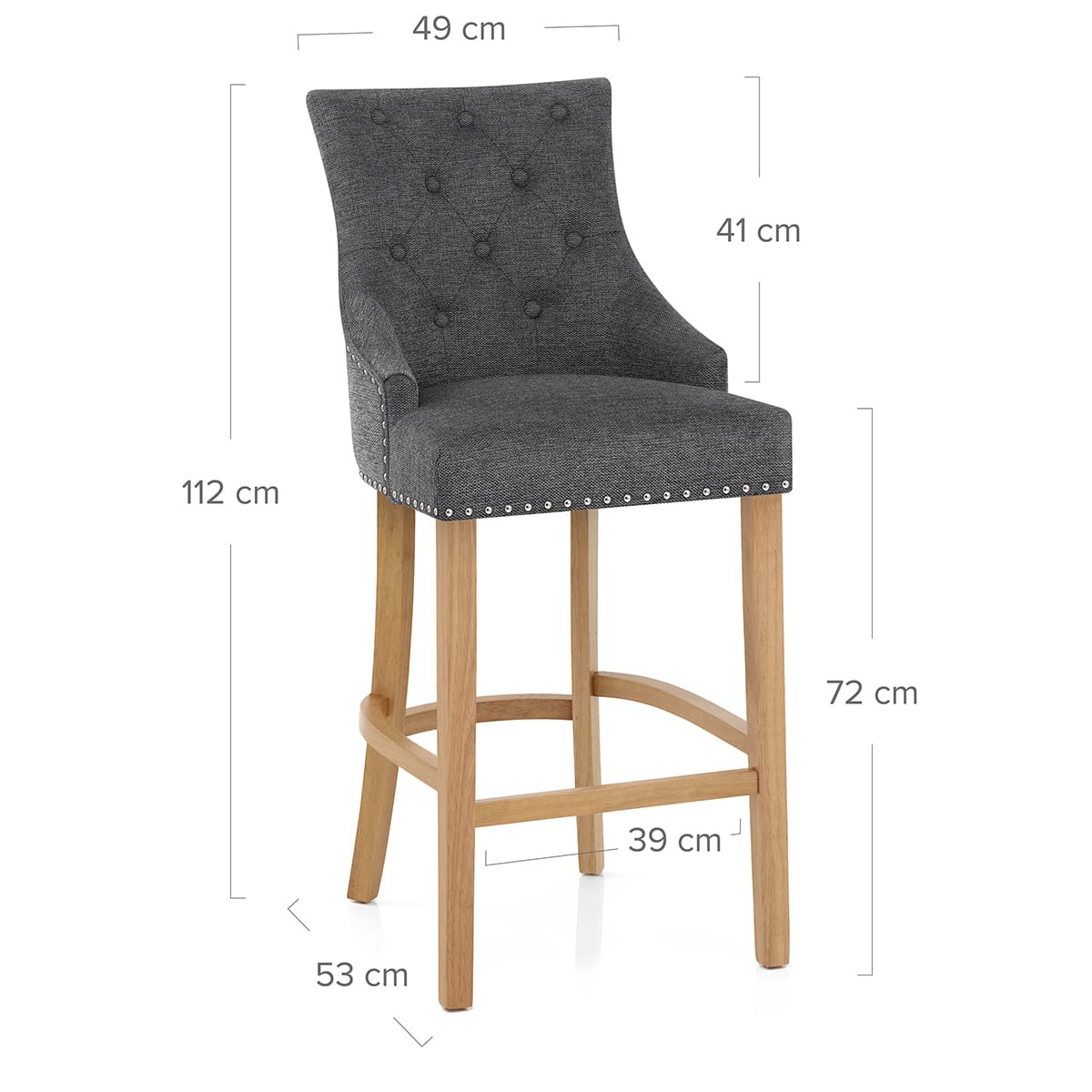 Completely comfortable, the padded seat also has a webbed support and is covered in chic charcoal fabric. A tall backrest accompanies the seat and is decorated with button detail and a feature chrome ring on the rear. Plus, chrome studs edge the entire seat for tasteful embellishment.