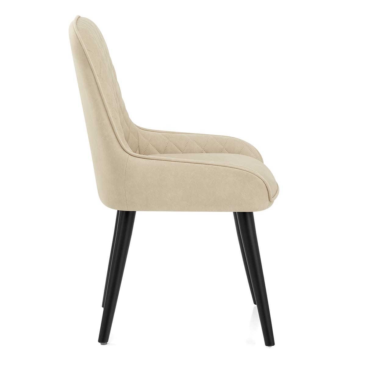 A beige faux leather seat sports a range of features. Starting with a tall backrest that descends in to sweeping side sections to cosset the body, the seat is filled with sumptuous padding. Delicate diamond stitch detailing patterns the inside of the back and arms and a piped edging surrounds the seat, highlighting its encompassing shape.