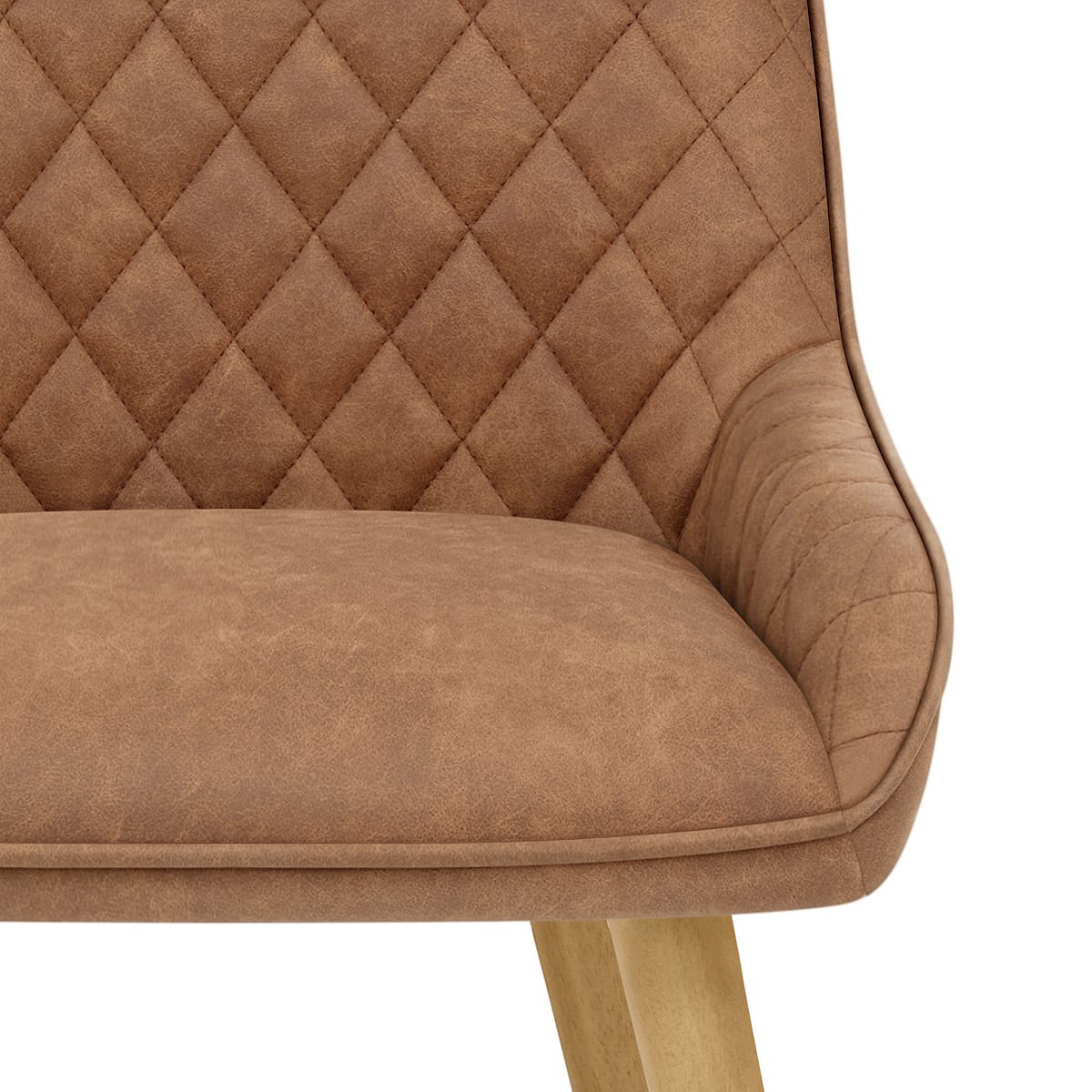Adorning the inside of the tan faux leather seat is an intricate diamond patterning that coats the inner of the tall back and sides. For a secure and relaxing feeling, these elements wrap around the body and connect to a smooth seat pad, filled with high levels of foam. Finally, a flowing line of stitched piping perimeters the seat and details its curvaceous shape.