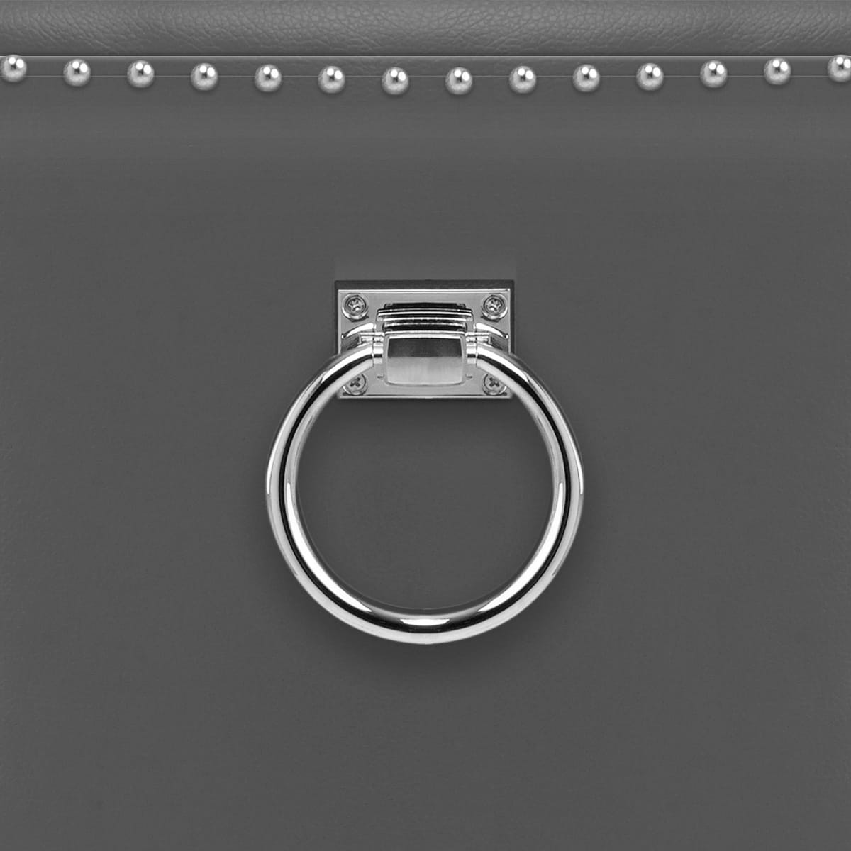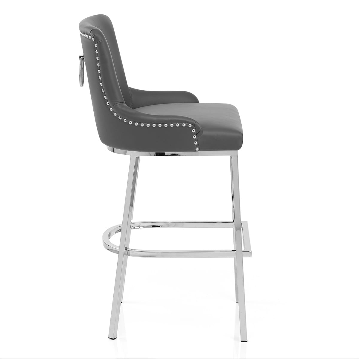 Glamorous grey faux leather upholsters the seat and tall back, which has a smooth padded design on the front, and features a splendid chrome ring with chrome stud edging on the rear.