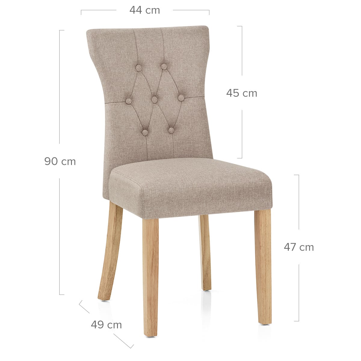 Most dining and kitchen tables measure about 75cm in height. For comfortable seating, it’s best to allow roughly 25–30cm of clearance between the table underside and the chair seat. This means a chair seat height of around 45cm is usually ideal.