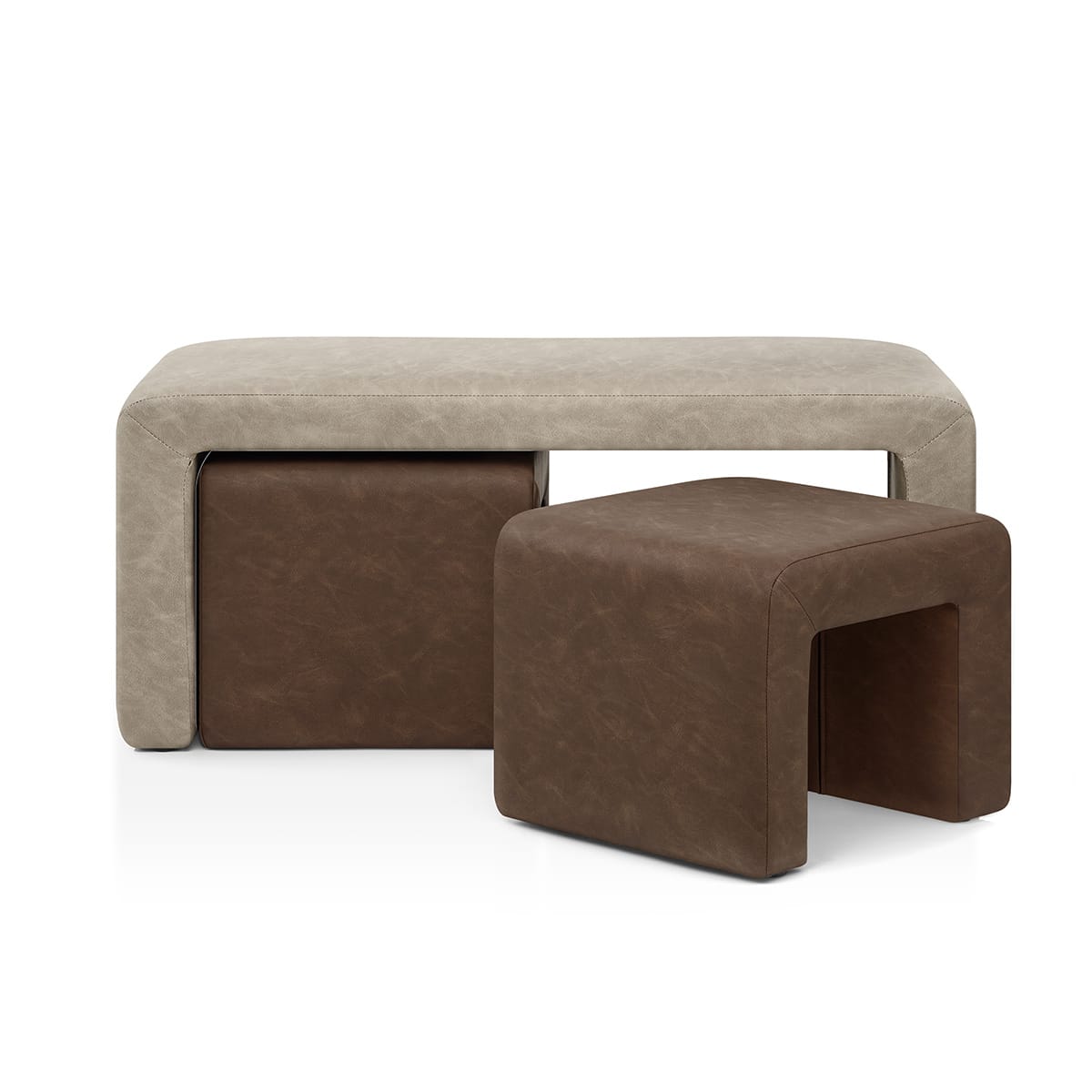 Sculpted with smooth edges and upholstered in soft brown faux leather, these cube-like stools are both stylish and space-saving. Their design allows them to slide neatly under the bench, ready for extra guests or relaxed lounging. Use them as footrests or standalone seats ' their form is functional and visually appealing for lasting use.