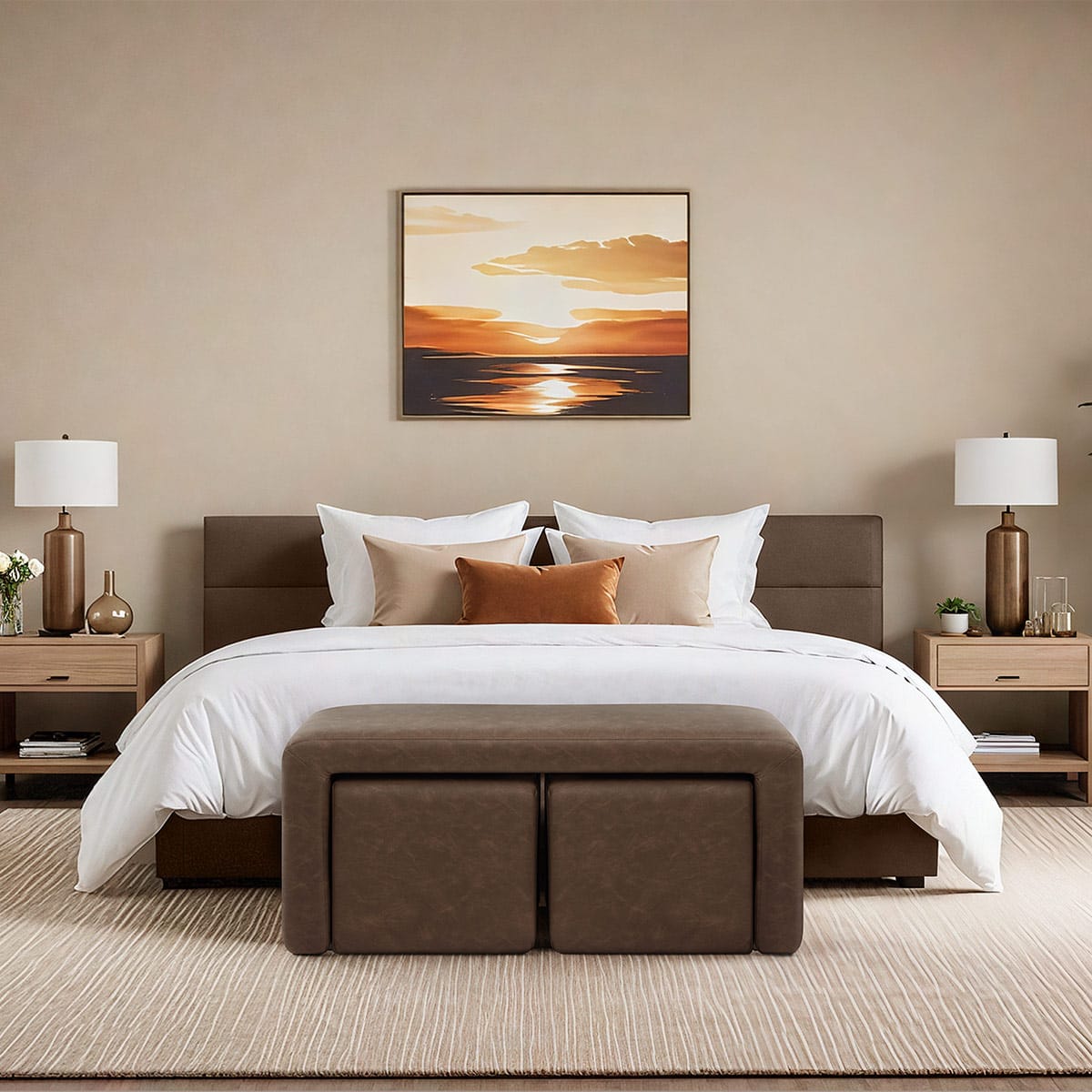 These cube-like stools are beautifully crafted with smooth faux leather and softly rounded corners. Designed to tuck neatly beneath the bench, they're perfect for extra seating or doubling as footrests. Their nesting design keeps things protected and organised. Functional, sleek and subtle, they add seating without taking up extra space.