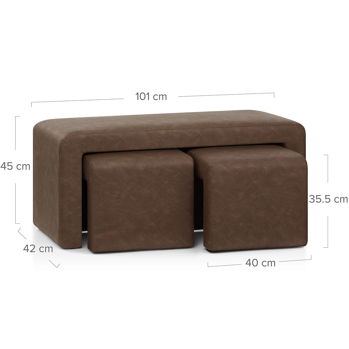 The main bench is wrapped in matching faux leather for a cohesive, elegant finish. Designed to house both stools securely within, it offers a visually clean and organised solution. With an efficient structure and soft, square form, it fits effortlessly in modern interiors. Adjustable feet underneath help to safeguard flooring while ensuring a stable base - perfect for minimalist living with a functional twist.