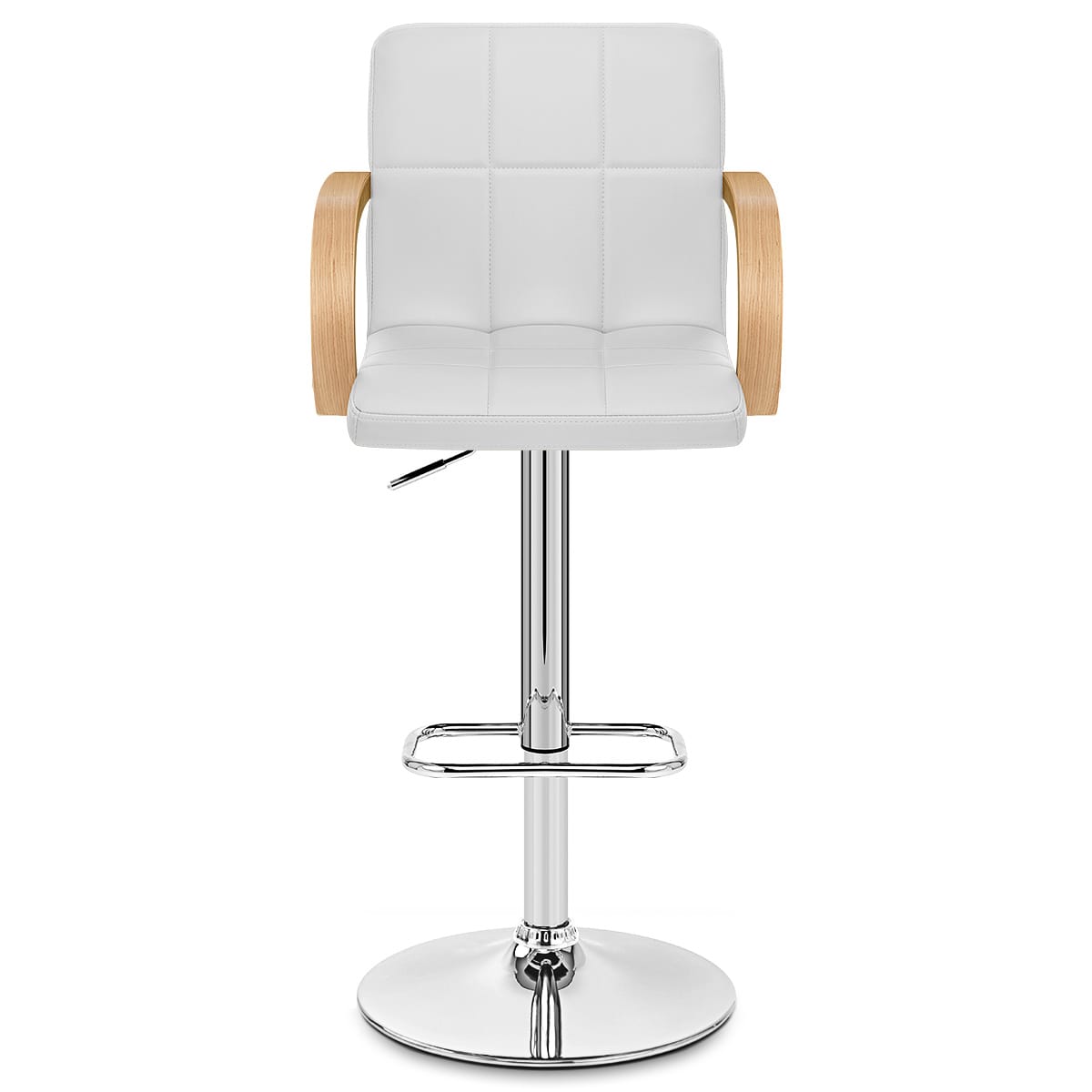 Modern and minimalist, the crisp white faux leather with panelled detailing invites you to sit back and relax, whilst curved oak finished bentwood arms provide additional support. The cushioned seat and high backrest deliver superb comfort, meanwhile the 360 degree swivel and gas lift mechanism allow you to tailor the stool to suit your needs.