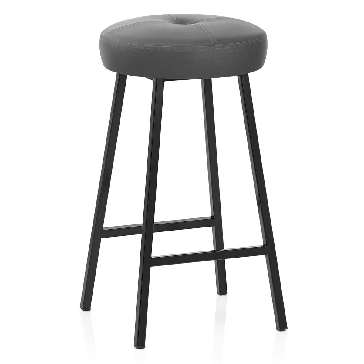 A distinguished looking backless seat is patterned with double-stitched lines, meeting in the centre. Dense cushioning provides a highly comfortable feel and appearance, with the stool's appealing grey faux leather upholstery adding to an overall impression of contemporary living.