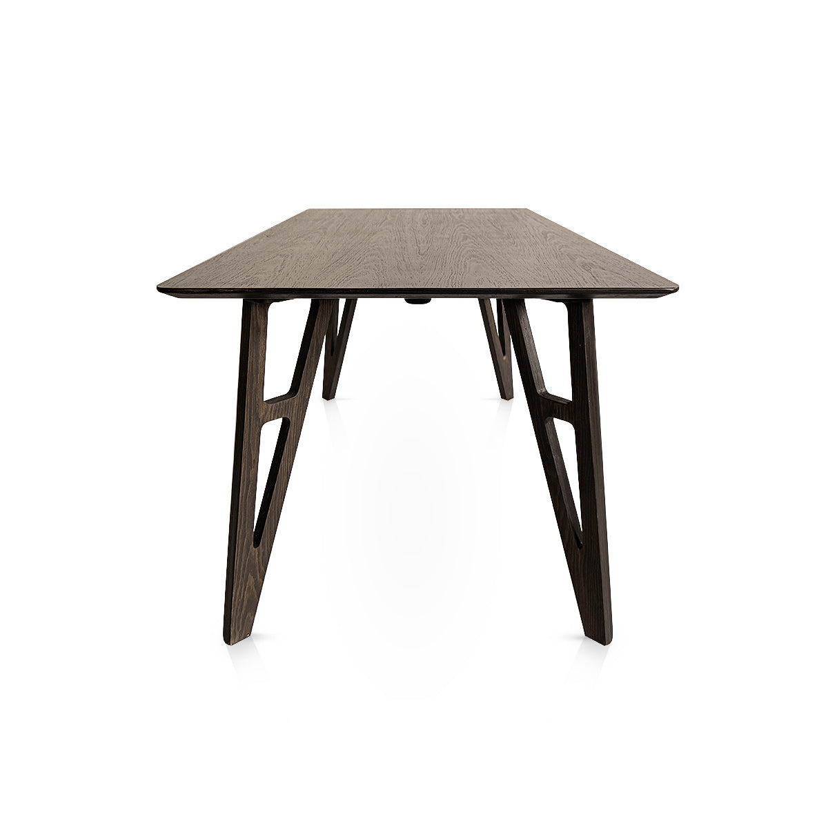 Four triangular legs form the inverted A-frame base, bringing both stability and visual interest. Crafted from matching dark wood, each leg is designed for strength while keeping the profile streamlined and modern. Protective pads safeguard floors from marks and scratches, making it as practical as it is stylish. The solid construction ensures a lasting foundation for years of shared dining experiences.