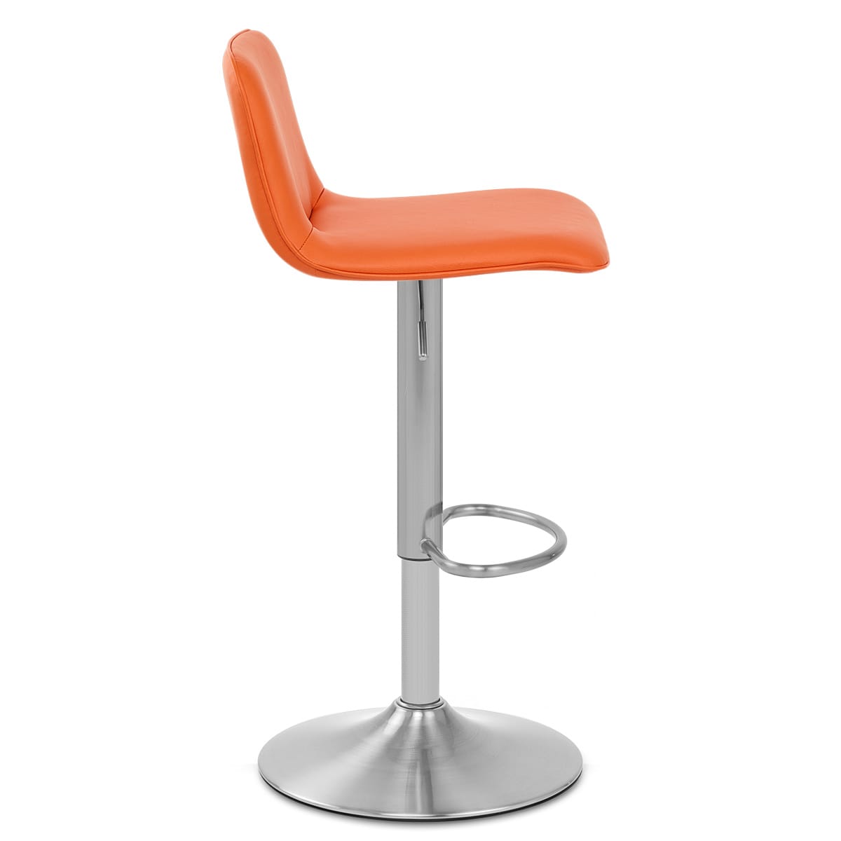 A brushed steel frame stands confidently beneath the contrasting orange seat. Manufactured with a gas-lift mechanism, the column accommodates for 360-degree swivel motion and adjustable height, providing ease of access to kitchen bars. The frame also includes a trendy half-moon-shaped footrest and a circular base complete with protective rim, to help in maintaining your floors.