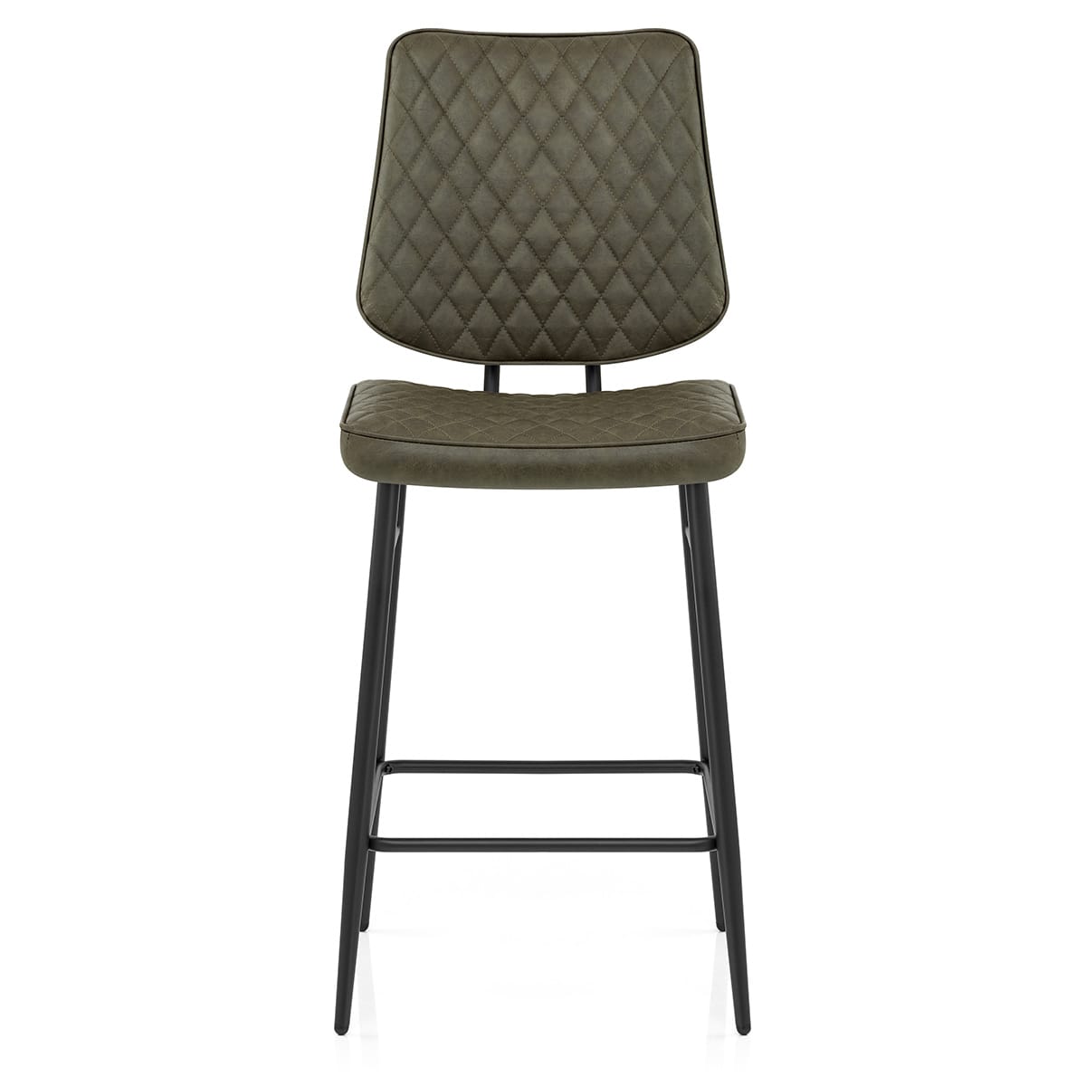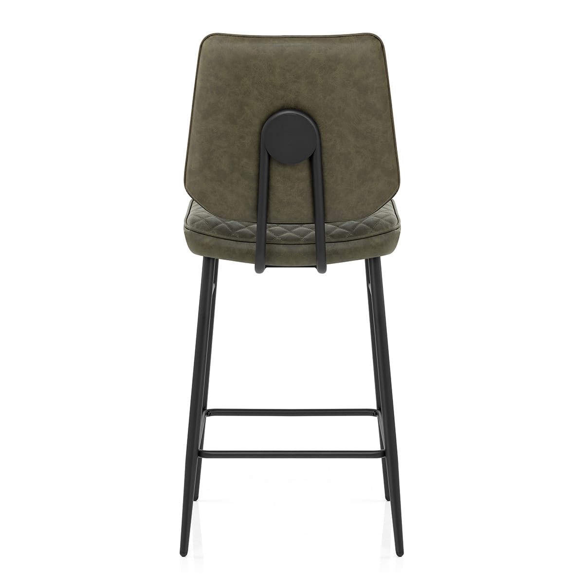 Padded for the upmost comfort, both the seat pad and the elevated backrest are upholstered in a glorious shade of green faux leather. Linked together by two black metal connectors, both the pad top and inner back are detailed with a decorative diamond stitch and the separation of the two elements makes for an airy and visually minimalistic design.