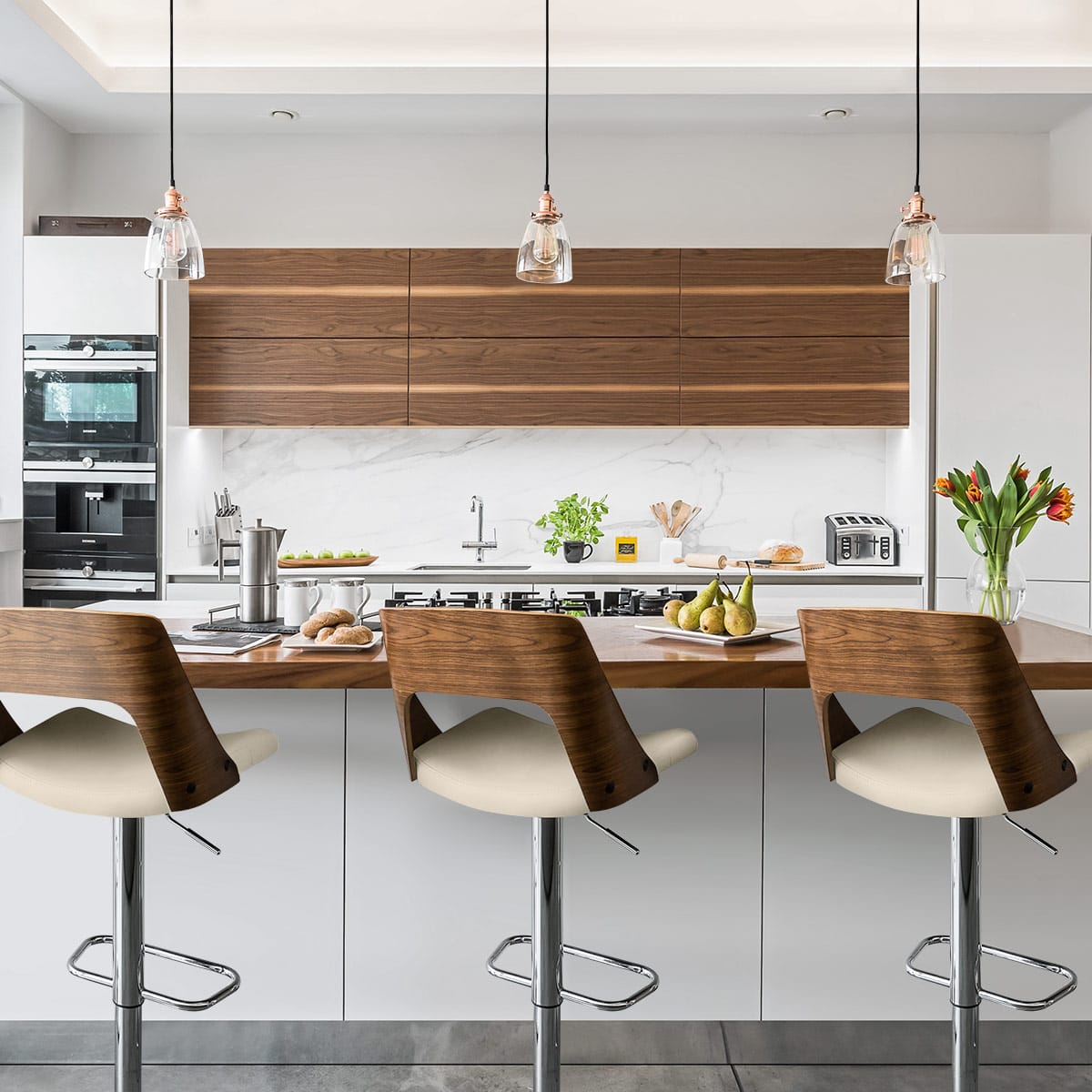 Bar stools generally come in two main heights - kitchen counter (around 65cm) and bar height (around 75cm). Measure the distance from your floor to the underside of your counter and leave around 25–30cm for comfortable legroom.