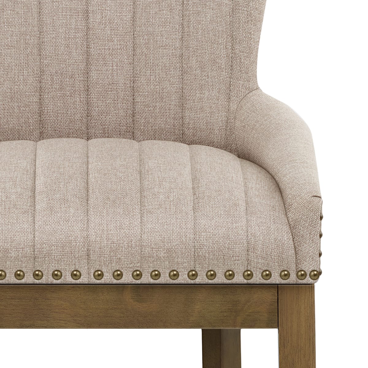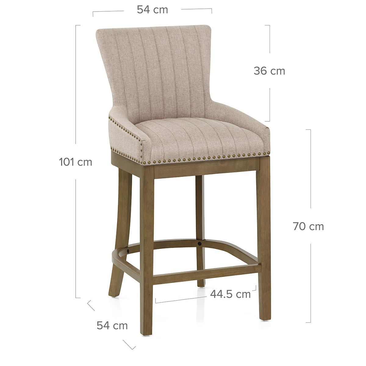 The plump seat padding is encased in gorgeous tweed fabric, with a belted underside and risen sides partly enclosing it for extra assurance as you sit. These are connected to the tall and supportive backrest, shaped for optimal support. The entire seat has antique brass studs along the outer edges, and finely stitched vertical lines along the inner sides, emphasising the contemporary nature of the stool.