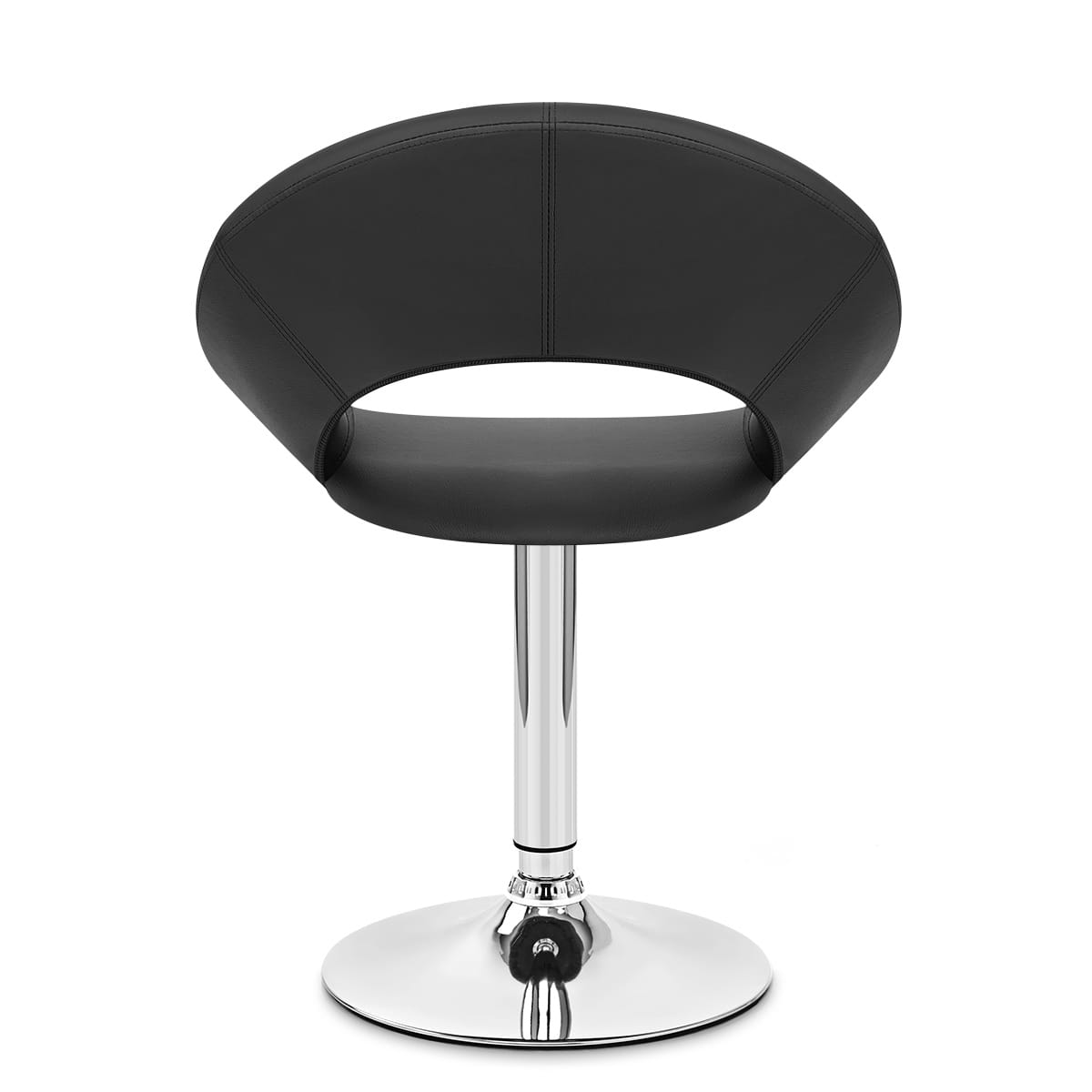 The eye-catching seat is cushioned with high density foam padding, from the round seating area through to the wide, curved backrest that arches its way from one side of the seat to the other in one seamless, graceful sweep. Upholstered in trendy black faux leather, it exudes an undeniably sumptuous look and comfortable feel.