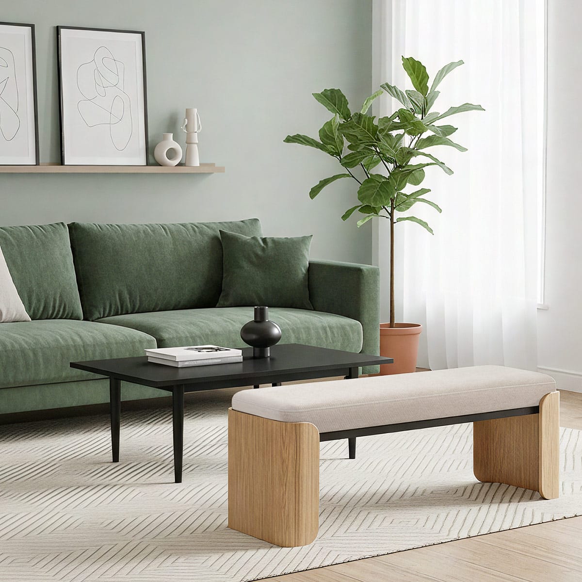 Two sculpted oak bentwood legs anchor each end of the bench, curving inward for both elegance and strength. Spanning the full width of the seat, they offer balanced, reliable support. A discreet storage space beneath adds function without bulk, while felt pads beneath each leg help protect your flooring. It's a thoughtful blend of form and practicality.