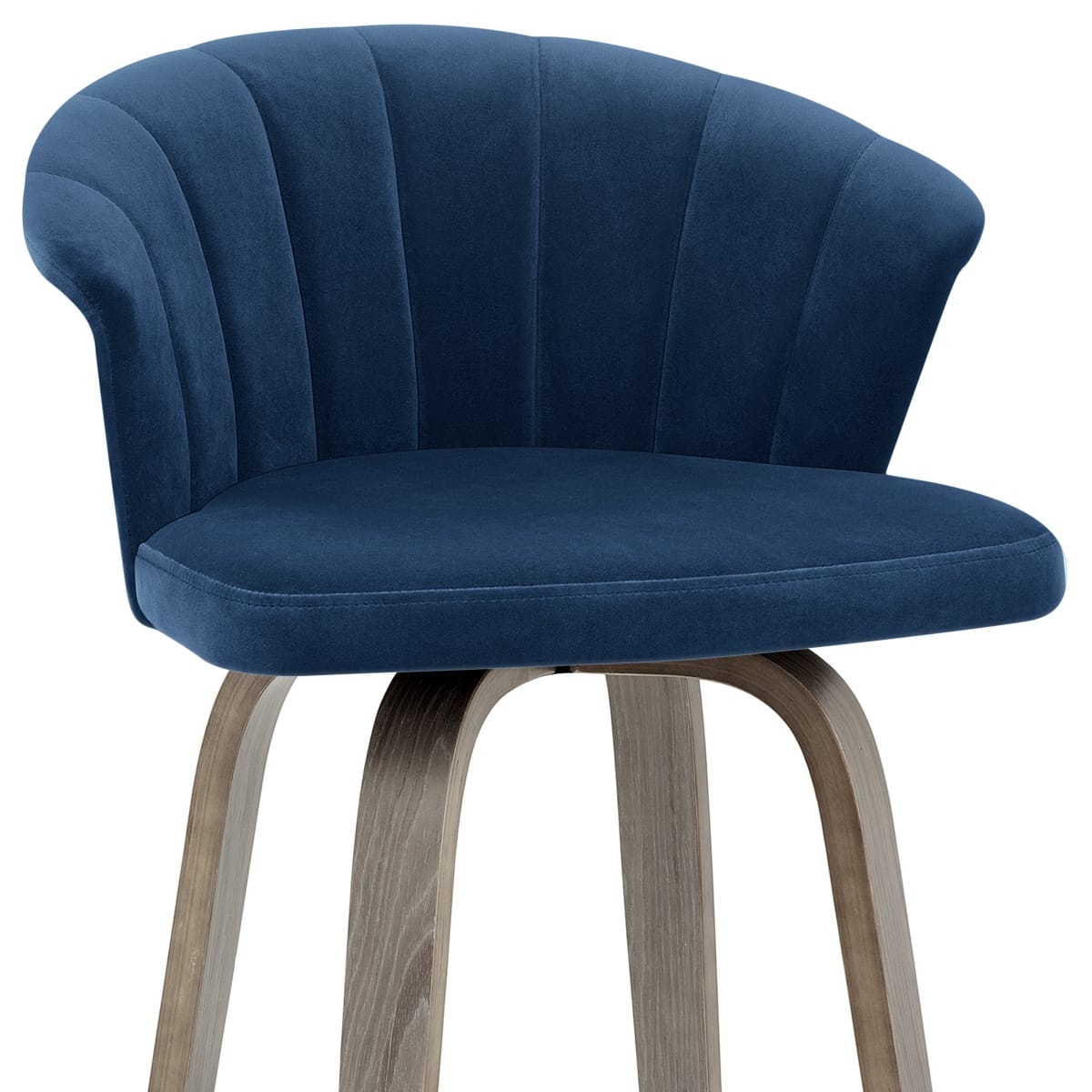 Swathed in a captivating shade of blue velvet, the densely padded seat incorporates an arched backrest section with bold vertical stitch detailing. Grey bentwood encases the rear of the seat, pairing with the cool hue of the velvet for a relaxing overall effect.