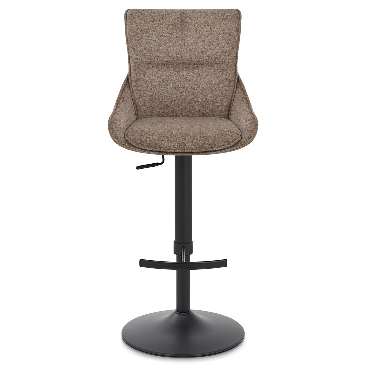 The brown fabric seat is designed with comfort and sophistication in mind. Foam-filled cushions create a tall inset backrest and seat pad, which are then wrapped within an outer shell, giving off a winged appearance with a piped edge bordering the seat. The sides of the cushion are slightly curved to provide the ideal amount of support, and detail is added via a horizontal stitch in the back.