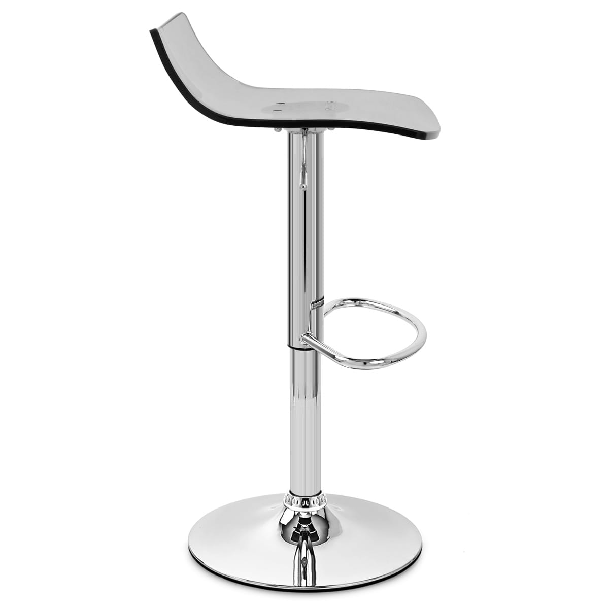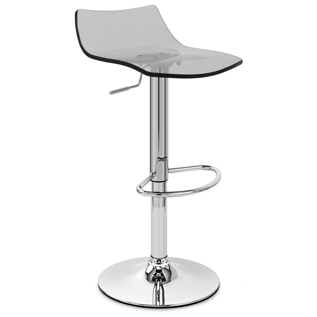With a chunky seat moulded from translucent smoked acrylic, it is enhanced with a black edge that gives it a fresh look. The flowing seat, recessed at the front, is made to be ergonomic, giving you the best in comfort whilst keeping to a beautifully formed shape. The seat rises at the rear into a low arching backrest that provides added support and increases the overall comfort of the stool, making it ideal for a breakfast bar.