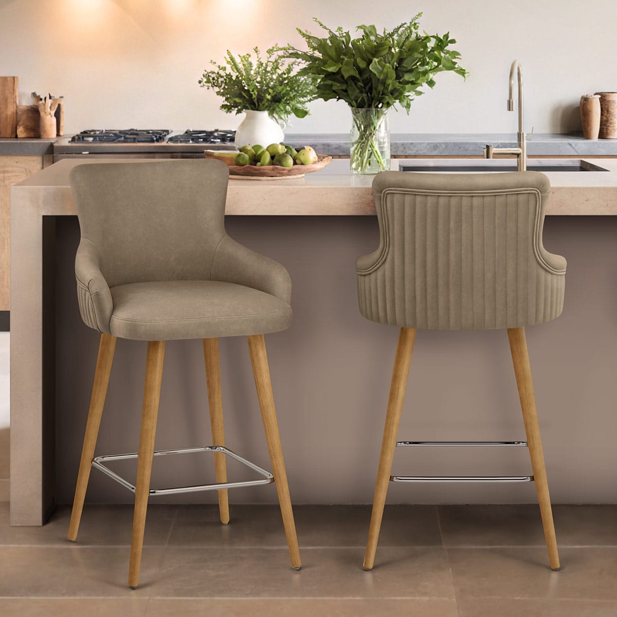 Working with the seat above, a fixed kitchen height frame stands strong beneath. A robust design comprised of four wooden legs that taper to the floor and are intersected by a quartet of chrome horizontal struts, the front of which makes the perfect place to rest your feet. Adjustable protective feet sit on the underside and will help look after your floors.