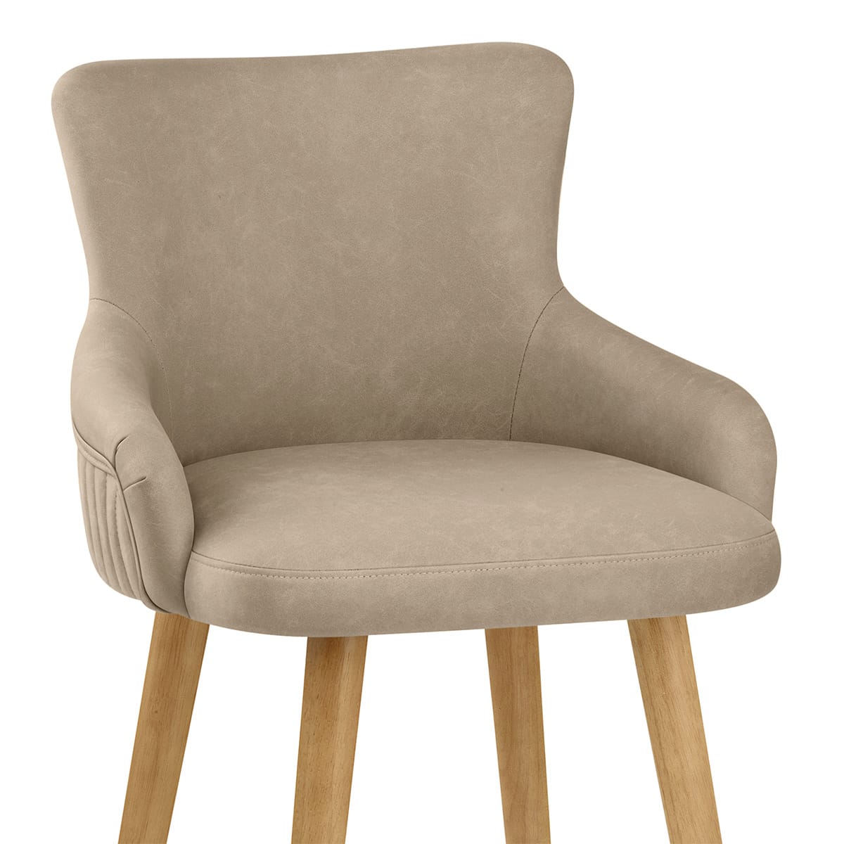 Smart brown faux leather upholstery cloaks a layer of dense padding to create a cushioned and relaxing seat. A tall and shapely backrest curves around the seat pad, running into two supportive armrests for an encompassing experience. Displayed on the rear are vertical lines of stitch detail that create a segmented pattern, bordered with a line of stitched piping.