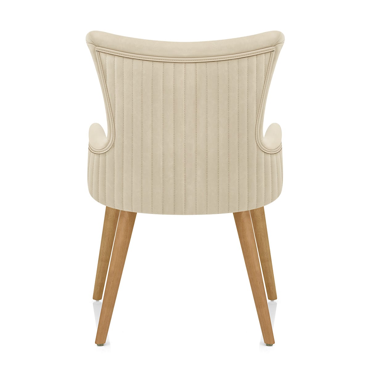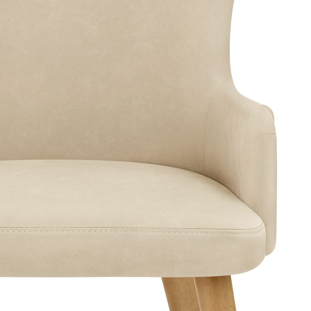 Brilliant beige faux leather covers the seat and enhances the shapely contours of its modern wing back style. A subtle striped effect is created on the rear of the tall backrest thanks to lines of vertical stitching, and this is bordered by an edge of piped trim. Supportive armrests rise from the sides and contain the well cushioned seat pad.