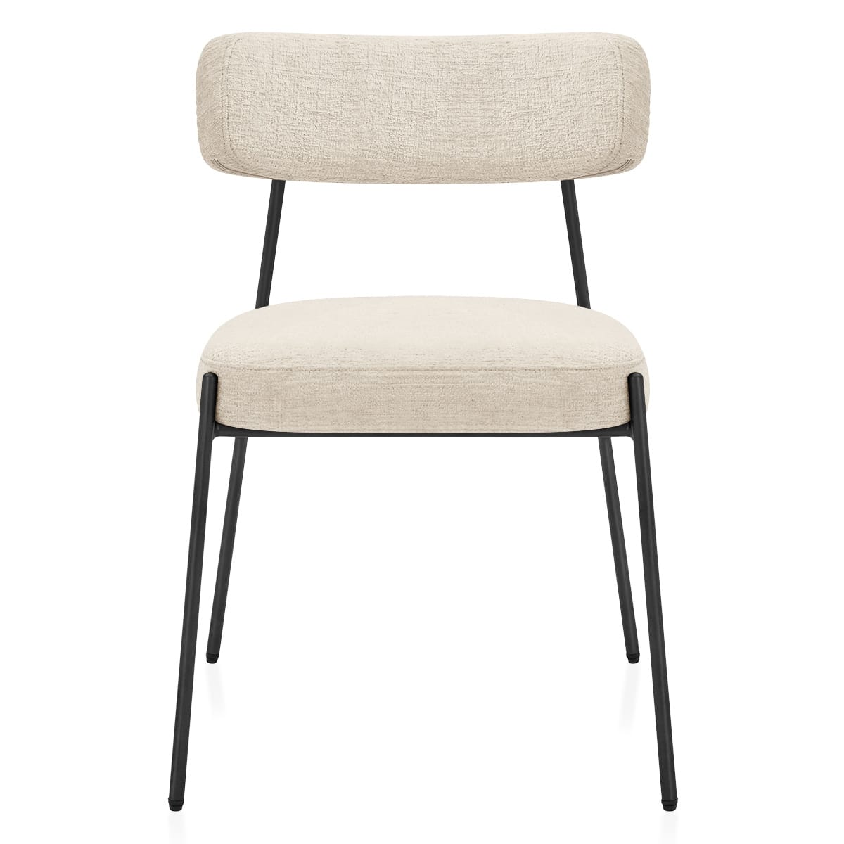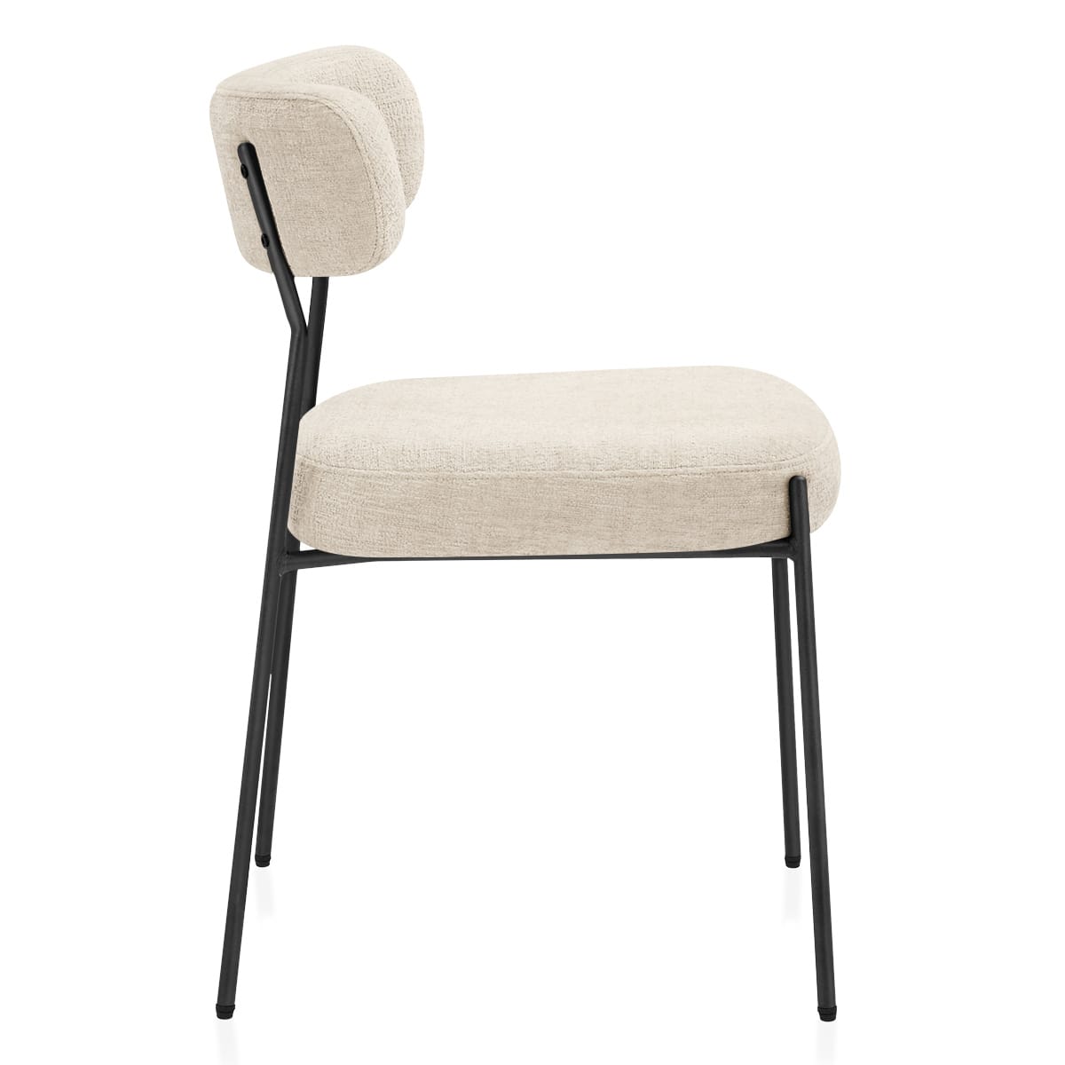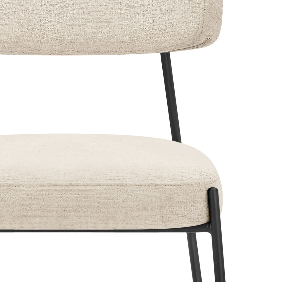Generously padded and shaped to support you, the seat and gently curved backrest are connected by two sleek tubular struts that extend from the chair's black metal frame. The open space between seat and backrest adds a contemporary edge while giving visual room to breathe. Both elements are wrapped in a soft, textured cream fabric that invites you to sit and stay awhile.