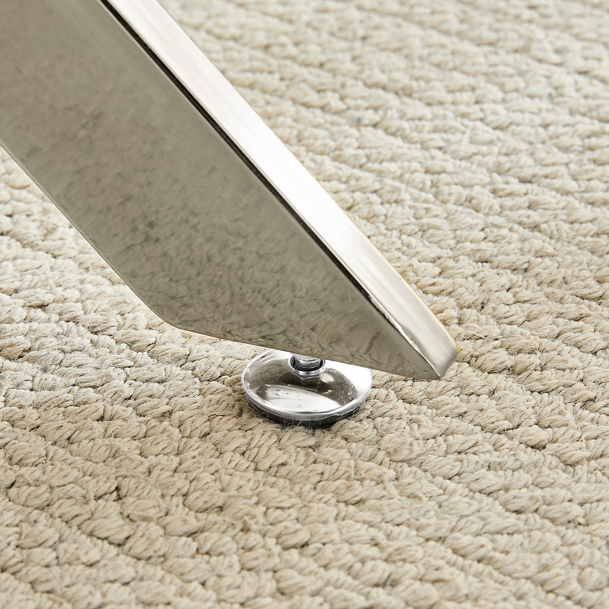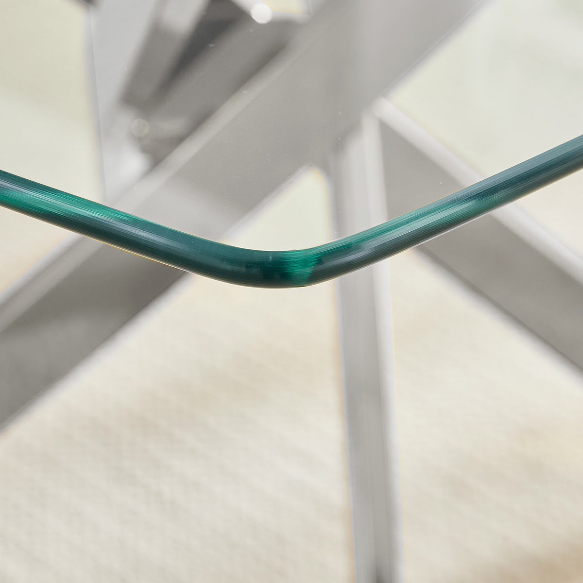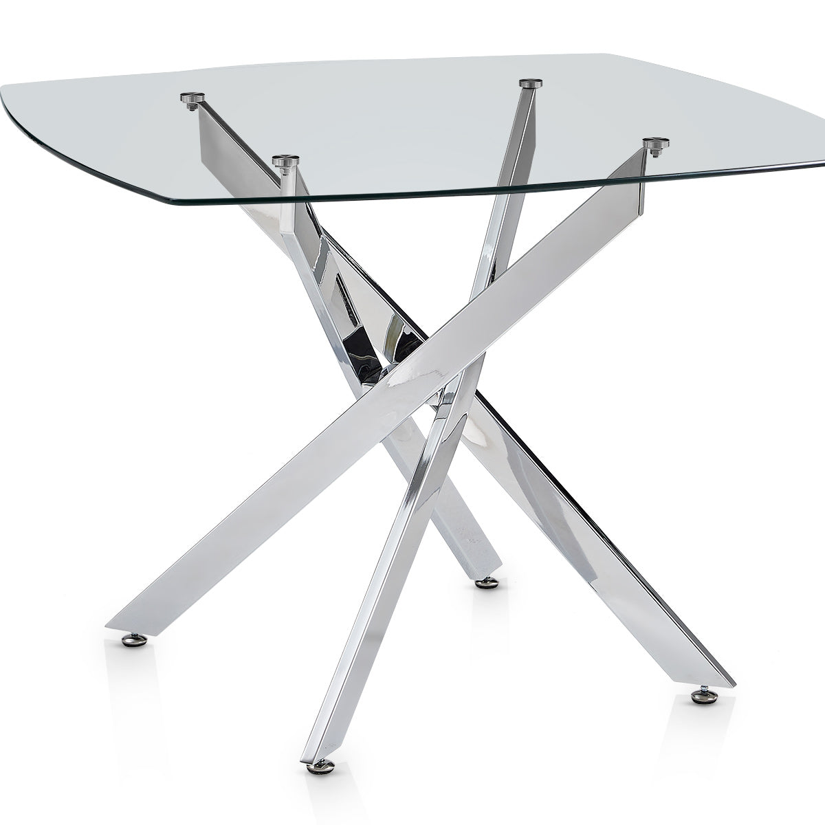Below the glass top, a polished chrome frame takes centre stage with its intersecting supports arranged in a bold X-shaped configuration. The reflective finish enhances the table’s modern character while offering reliable strength and balance. Adjustable protective feet help ensure stability on a variety of floors, completing a base that effortlessly merges style with practicality.
