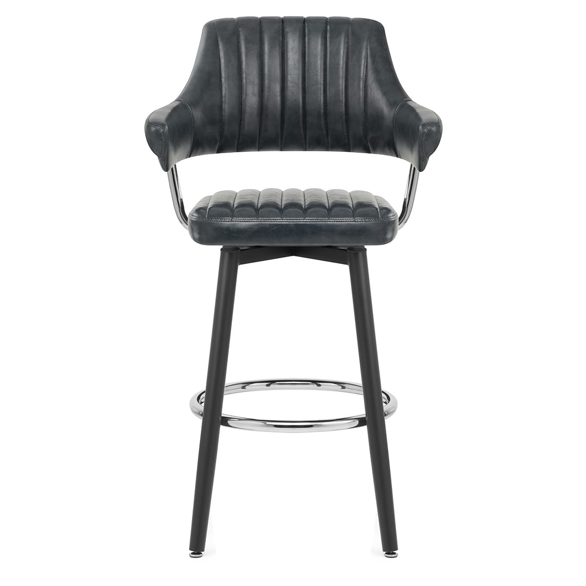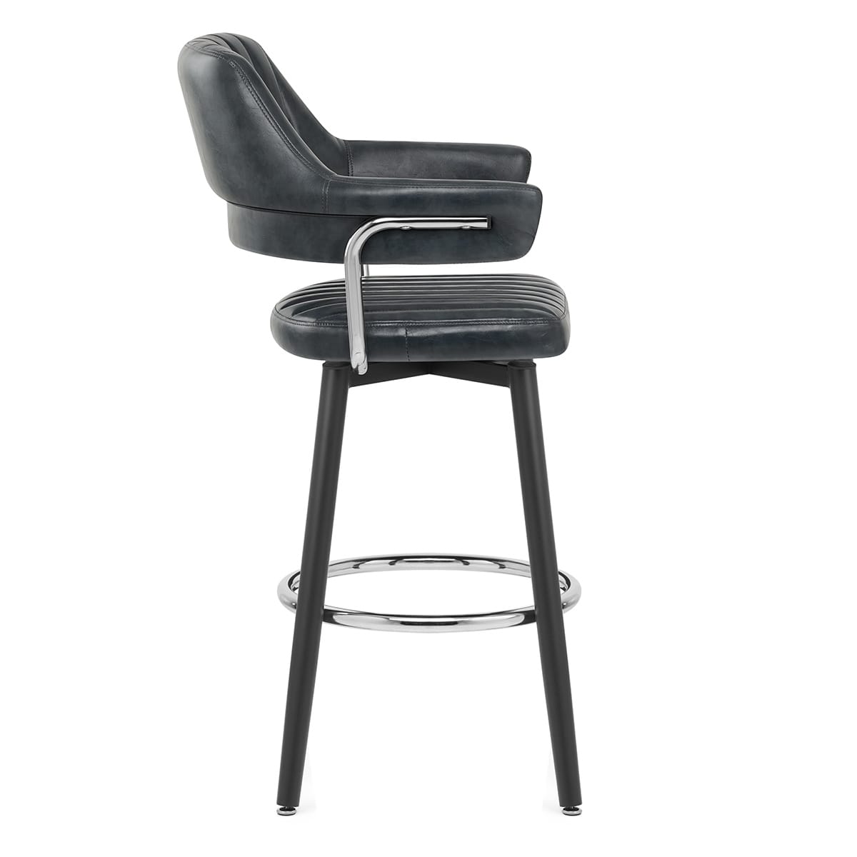 With a desirable antique effect to its slate faux leather upholstery, the Emily looks impressive and feels just as good. A comfortable backrest with sweeping arms is vertically segmented for emphasis, connected to a matching seat pad by bracing bars in a chrome finish.