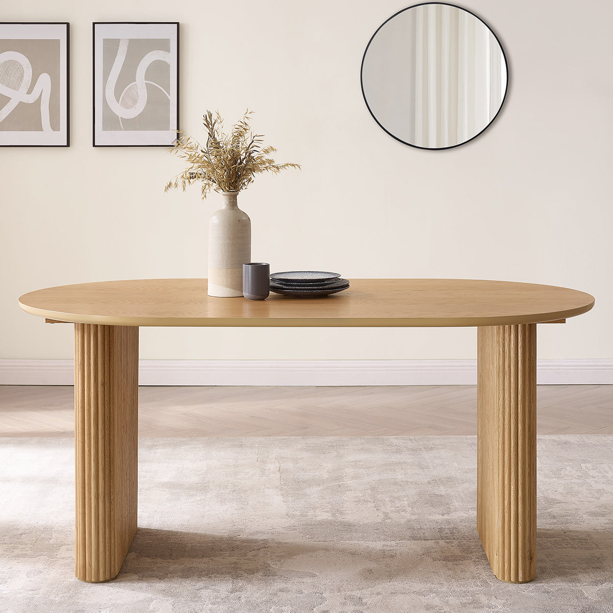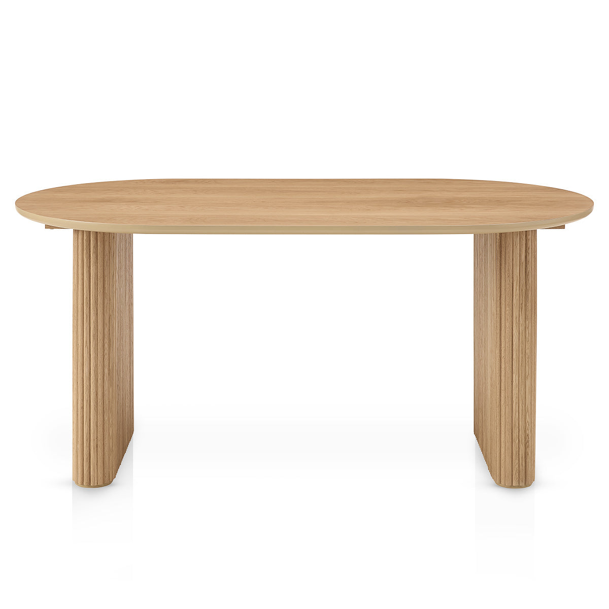 Two statement pedestal columns anchor the table, crafted from oak-veneered wood for stability and style. Their upright fluted pattern creates a textured, architectural finish that elevates the table's minimalist form. Designed with a lacquered coating for resilience and fitted with protective pads to help prevent floor marking, the frame provides a harmonious balance of practicality, durability and modern design appeal.