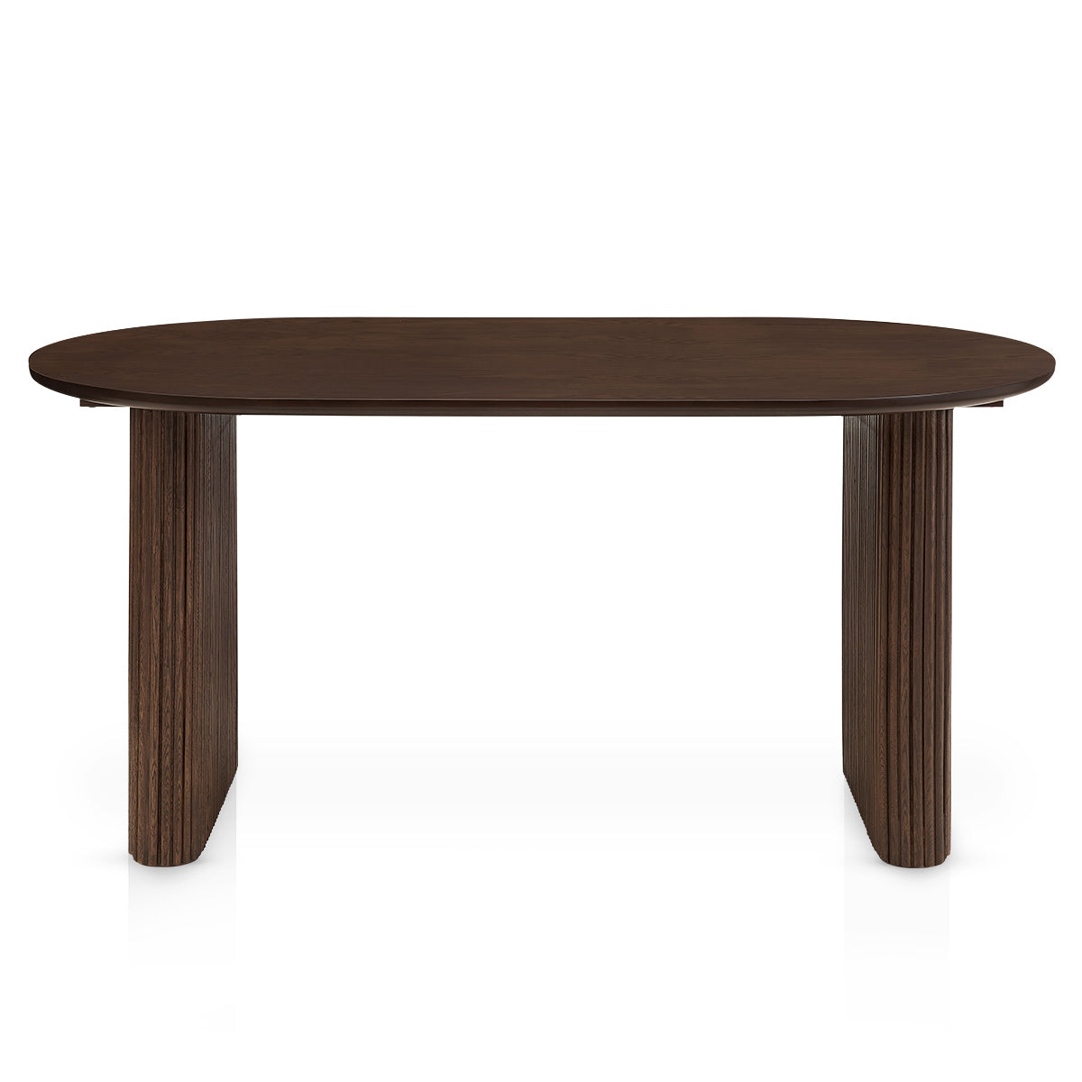 The frame is defined by two walnut-veneered columns positioned at either end, providing both strength and architectural style. Each pedestal features vertical fluted detailing that creates depth and visual intrigue, complementing the smooth tabletop above. With a lacquered finish for lasting quality and discreet protective pads beneath, the base balances practicality and elegance, safeguarding floors while serving as a bold design statement.