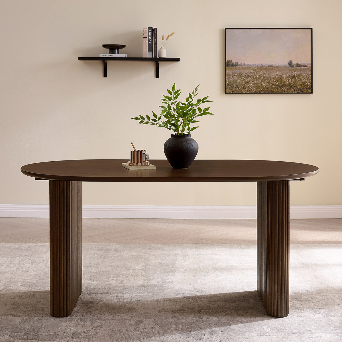 Crafted from solid wood with a walnut veneered surface, the Etna's oval tabletop combines durability with cultivated beauty. Measuring 160cm in length and 2.5cm thick, it offers a generous setting that accommodates up to six chairs. Finished in a protective lacquer, the rich walnut tones highlight the natural wood grain for a sleek, polished look.