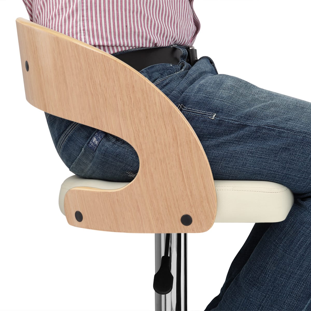 The oak backrest is faintly padded, for extra comfort to the owner, along with two slanted armrests. The backrest is attached to the cream faux leather seat, which is well cushioned so the owner feels supported when seated.