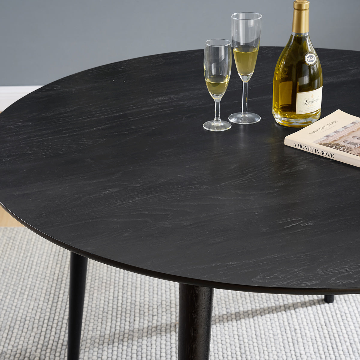 Crafted with a solid black tabletop, this design showcases a refined lacquered finish that enhances durability while highlighting subtle wood grain textures. The 120cm circular top, at 2cm thick, offers ample surface space for up to four chairs. Minimalist yet striking, it provides a modern focal point that balances style with practicality.