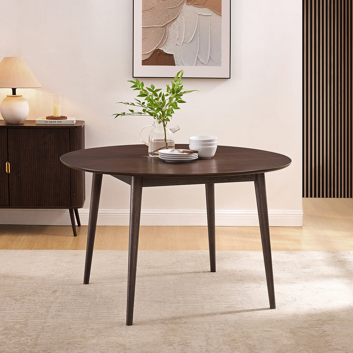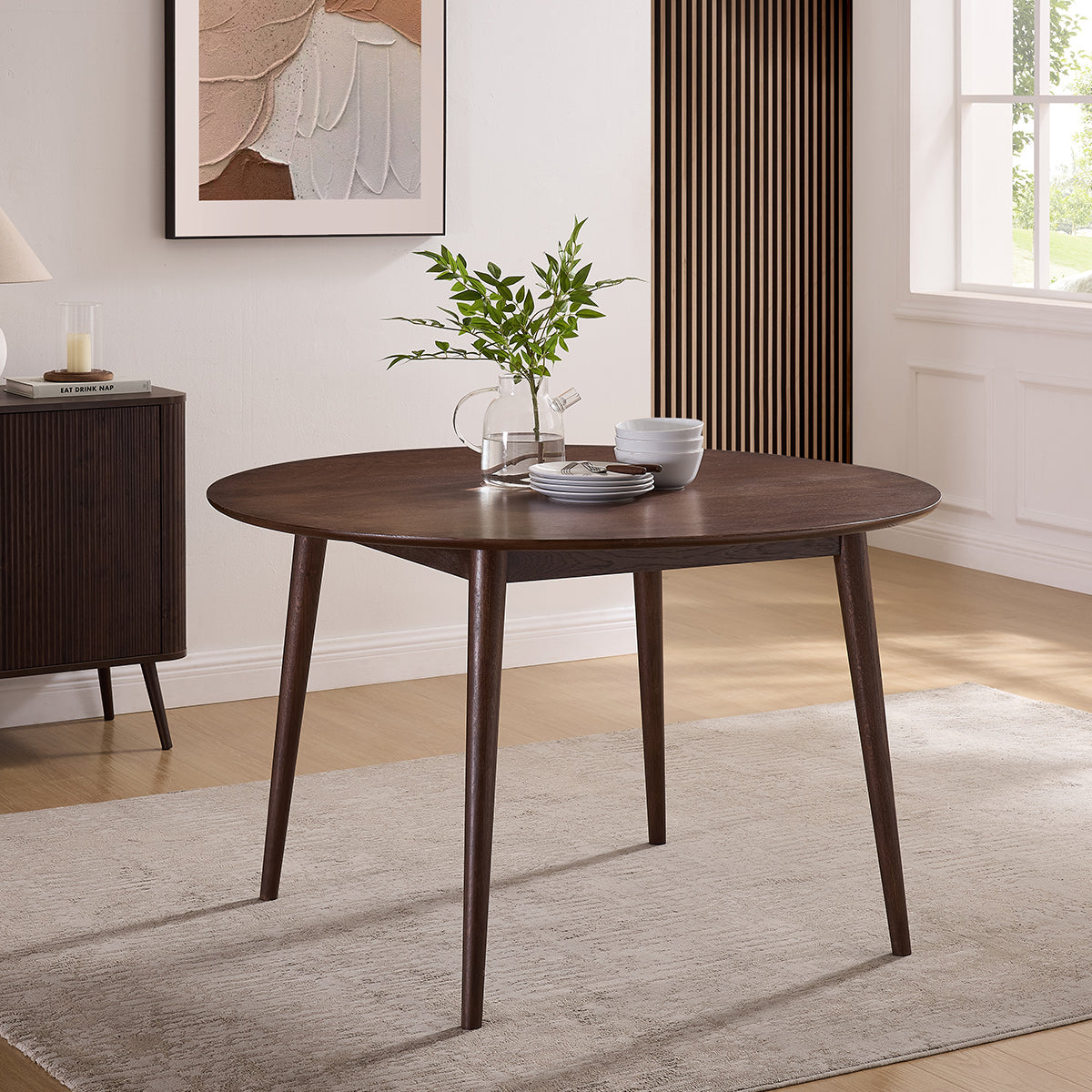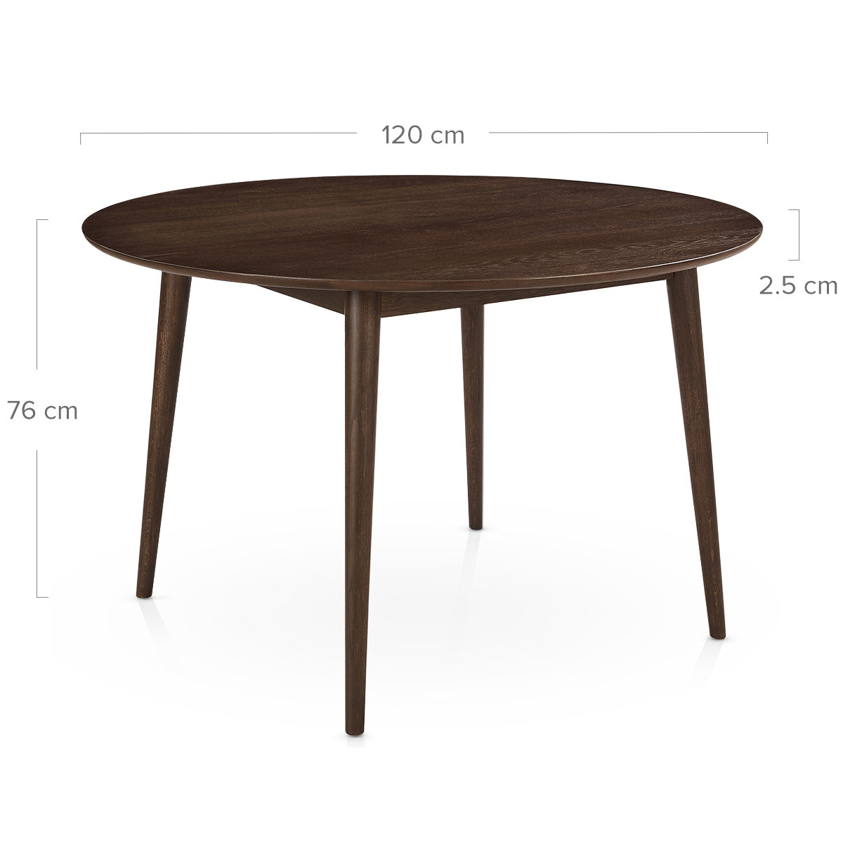 Finished in a lacquered walnut tone, the solid tabletop highlights distinctive wood grain patterns for a rich, organic look. With a generous 120cm circular diameter and a streamlined 2cm thickness, it accommodates four chairs comfortably. Its smooth surface makes it practical for daily use and its deep coloured finish makes it unassumingly beautiful.