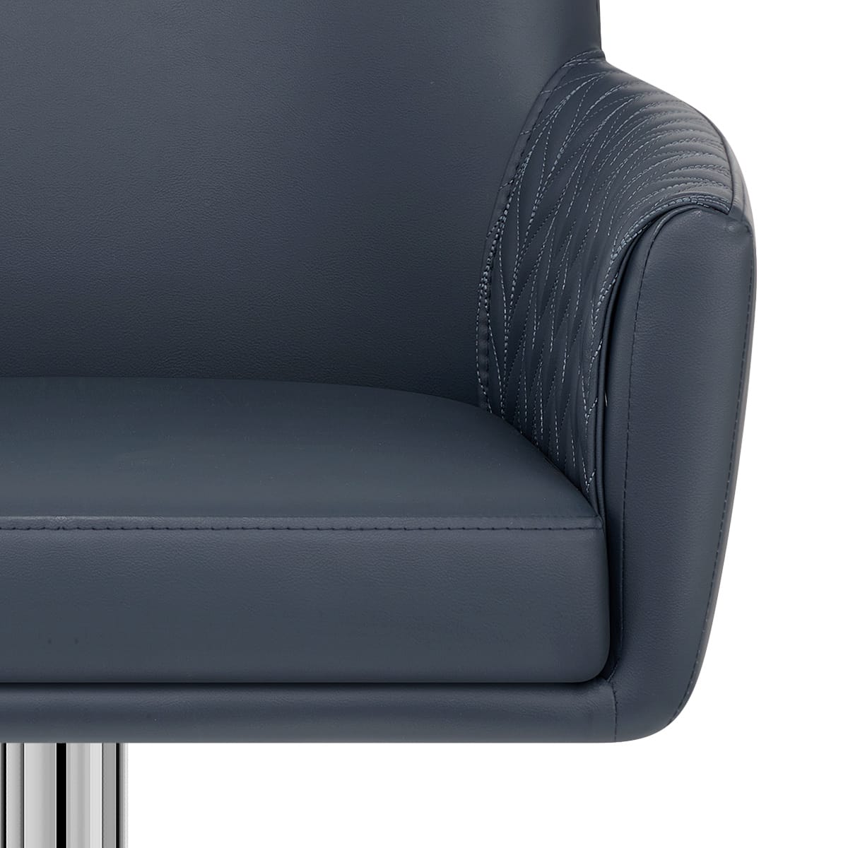 Crafted in smooth navy faux leather, the seat echoes a classic armchair with its secure structure and generous proportions. The tall backrest offers upright support, while the double-layered arms wrap around you with comfort. Inside the arms, elegant stitch detailing adds a decorative touch, enhancing its classic-meets-contemporary character and inviting everyday relaxation.